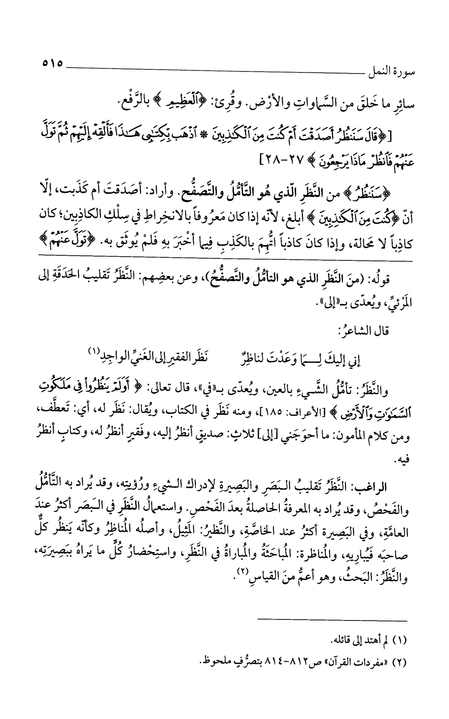 والنظر: تأمل الشيء بالعين، ويعدى بـ "في"، قال تعالى: {أَوَلَمْ يَنْظُرُوا فِي مَلَكُوتِ السَّمَاوَاتِ وَالْأَرْضِ} [الأعراف: 185]، ومنه نظر في الكتاب، ويقال: نظر له، أي: تعطف، ومن كلام المأمون: ما أحوجني [إلى] ثلاثٍ: صديقٍ أنظر إليه، وفقيرٍ أنظر له، وكتابٍ أنظر فيه.