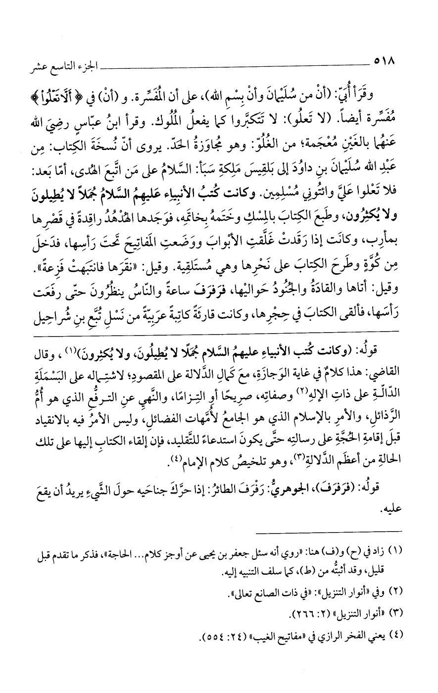 قوله: (وكانت كتب الأنبياء عليهم السلام جملًا لا يطيلون، ولا يكثرون)، وقال القاضي: هذا كلامٌ في غاية الوجازة، مع كمال الدلالة على المقصود، لاشتماله على البسملة الدالة على ذات الإله وصفاته، صريحًا أو التزامًا، والنهي عن الترفع الذي هو أم الرذائل، والأمر بالإسلام الذي هو الجامع لأمهات الفضائل، وليس الأمر فيه بالانقياد قبل إقامة الحجة على رسالته حتى يكون استدعاءً للتقليد، فإن إلقاء الكتاب إليها على تلك الحالة من أعظم الدلالة، وهو تلخيص كلام الإمام.