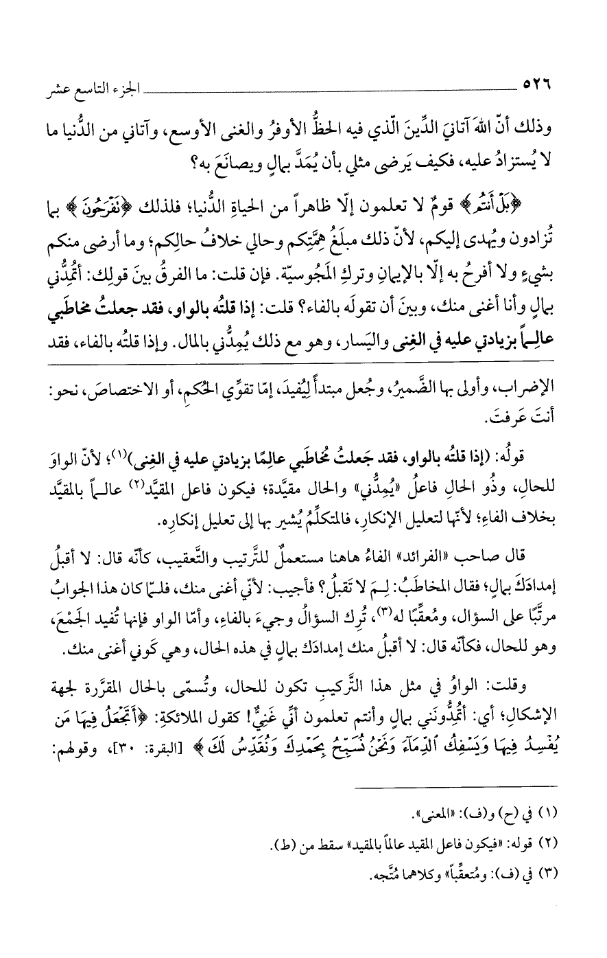 وقلت: الواو في مثل هذا التركيب تكون للحال، وتسمى بالحال المقررة لجهة الإشكال، أي: أتمدونني بمالٍ وأنتم تعلمون أني غنيٌ! كقول الملائكة: {أَتَجْعَلُ فِيهَا مَنْ يُفْسِدُ فِيهَا وَيَسْفِكُ الدِّمَاءَ وَنَحْنُ نُسَبِّحُ بِحَمْدِكَ وَنُقَدِّسُ لَكَ} [البقرة: 30]، وقولهم: