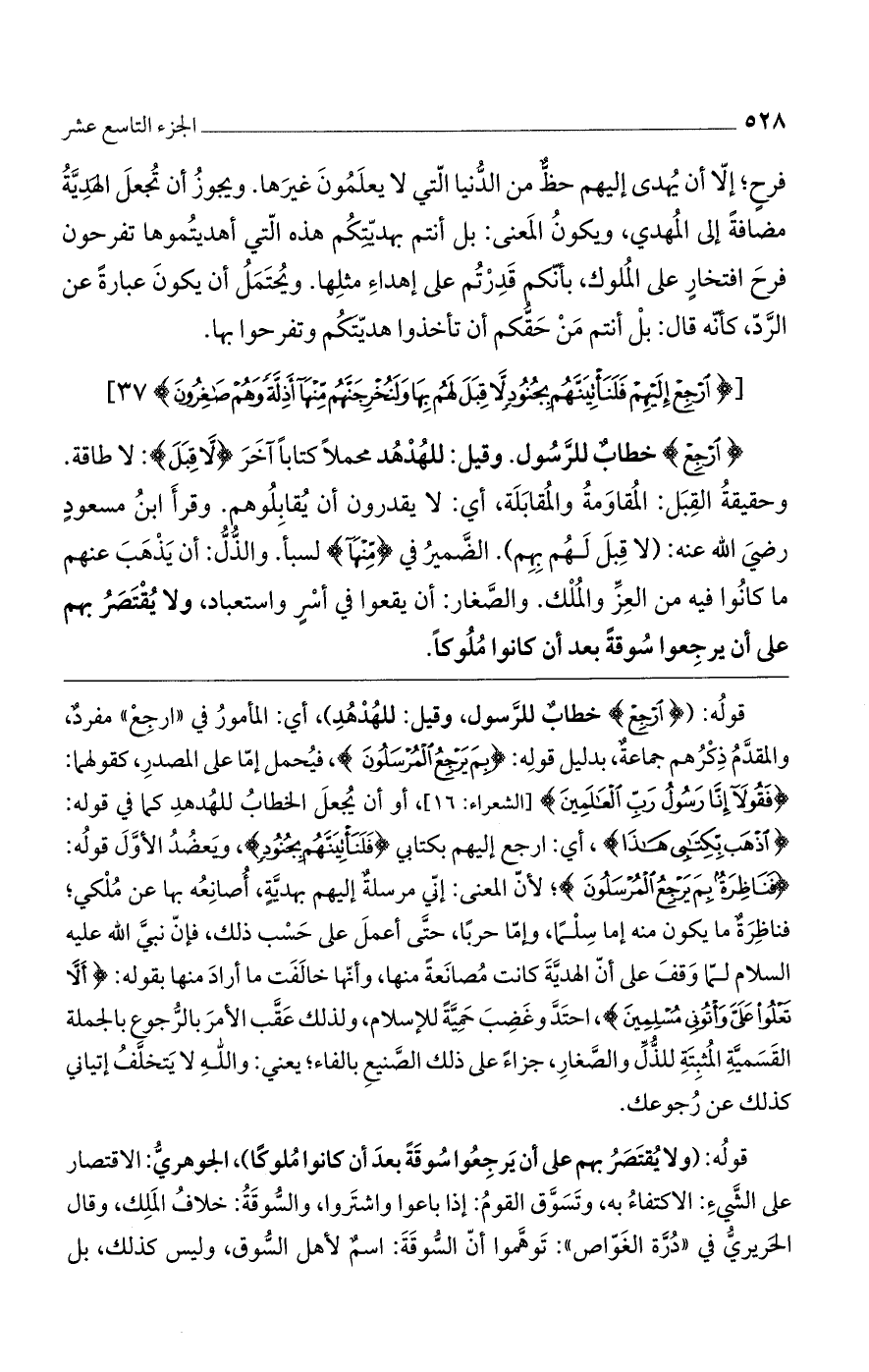 (ارْجِعْ) خطاب للرسول. وقيل: للهدهد محملا كتابا آخر (لَّا قِبَلَ): لا طاقة. وحقيقة القبل: المقاومة والمقابلة، أي: لا يقدرون أن يقابلوهم. وقرأ ابن مسعود رضي الله عنه: (لا قبل لهم بهم). الضمير في (مِنْهَا) لسبأ. والذل: أن يذهب عنهم ما كانوا فيه من العزّ والملك. والصغار: أن يقعوا في أسر واستعباد، ولا يقتصر بهم على أن يرجعوا سوقة بعد أن كانوا ملوكا.