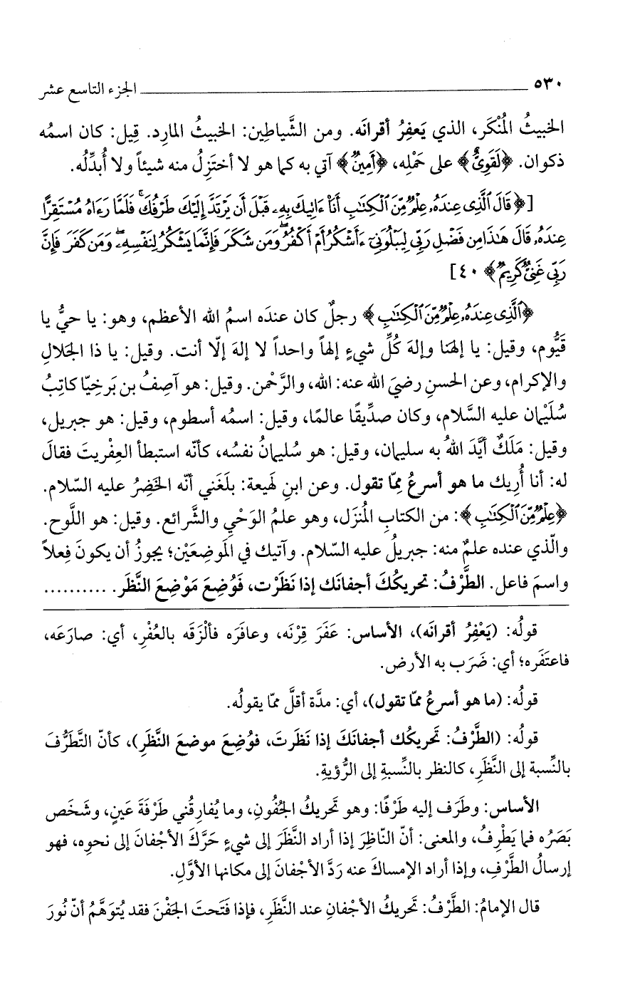(الَّذِي عِنْدَهُ عِلْمٌ مِنَ الْكِتابِ) رجل كان عنده اسم الله الأعظم، وهو: يا حي يا قيوم، وقيل: يا إلهنا وإله كل شيء إلها واحدا لا إله إلا أنت. وقيل: يا ذا الجلال والإكرام، وعن الحسن رضي الله عنه: الله، والرحمن. وقيل: هو آصف بن برخيا كاتب سليمان عليه السلام، وكان صدّيقا عالما. وقيل: اسمه أسطوم. وقيل: هو جبريل. وقيل: ملك أيد الله به سليمان. وقيل: هو سليمان نفسه، كأنه استبطأ العفريت فقال له: أنا أريك ما هو أسرع مما تقول. وعن ابن لهيعة: بلغني أنه الخضر عليه السلام: (عِلْمٌ مِّنَ الكِتَابِ): من الكتاب المنزل، وهو علم الوحي والشرائع. وقيل: هو اللوح. والذي عنده علم منه: جبريل عليه السلام. وآتيك في الموضعين يجوز أن يكون فعلا واسم فاعل. الطرف: تحريكك أجفانك إذا نظرت، فوضع موضع النظر.