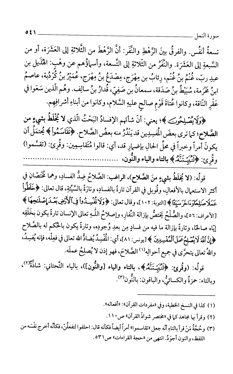 (وَلا يُصْلِحُونَ)؛ يعني: أن شأنهم الإفساد البحت الذي لا يخلط بشيء من الصلاح؛ كما ترى بعض المفسدين قد يندر منه بعض الصلاح. (تَقاسَمُوا) يحتمل أن يكون أمرا وخبرا في محل الحال بإضمار قد، أي: قالوا متقاسمين: وقرئ: (تقسَّموا) وقرئ: (لَنُبَيِّتَنَّهُ)، بالتاء والياء والنون،