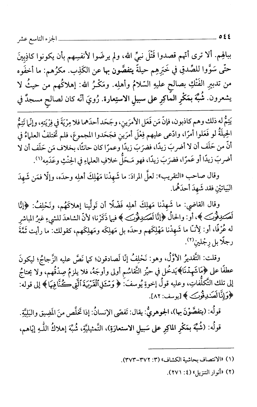 وقلت: التقدير الأول، وهو: نحلف إنا لصادقون، كما نص عليه الزجاج، ليكون عطفًا على {مَا شَهِدْنَا} يدخل في حيز التقاسم أولى وأوجه، فلا يلزم صدقهم، ولا يحتاج إلى تلك التكلفات، وعليه قول إخوة يوصف: {وَاسْأَلِ الْقَرْيَةَ الَّتِي كُنَّا فِيهَا} إلى قوله: {إِنَّا لَصَادِقُونَ} [يوسف: 82].