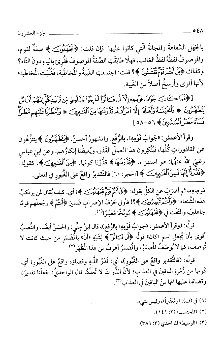وقرأ الأعمش: "جواب قومه"، بالرفع. والمشهورة أحسن (يَتَطَهَّرُونَ) يتنزهون عن القاذورات كلها، فينكرون هذا العمل القذر، ويغيظنا إنكارهم. وعن ابن عباس رضي الله عنهما: هو استهزاء (قَدَّرْناها) قدّرنا كونها. (مِنَ الْغابِرِينَ): كقوله: (قَدَّرْنا إِنَّها لَمِنَ الْغابِرِينَ) [الحجر: 60] فالتقدير واقع على الغبور في المعنى.