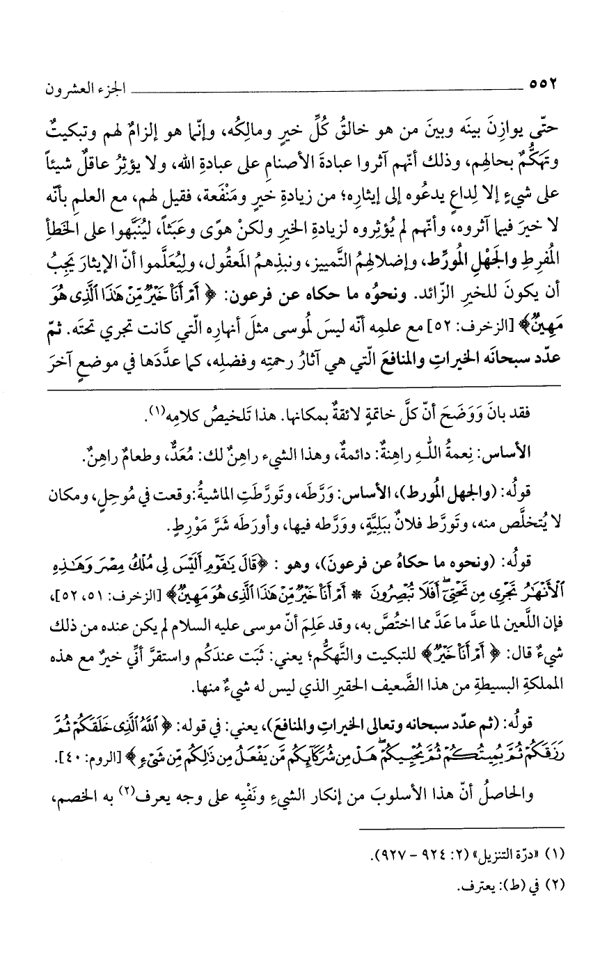 قوله: (ونحوه ما حكاه عن فرعون)، وهو: {قَالَ يَا قَوْمِ أَلَيْسَ لِي مُلْكُ مِصْرَ وَهَذِهِ الْأَنْهَارُ تَجْرِي مِنْ تَحْتِي أَفَلَا تُبْصِرُونَ (51) أَمْ أَنَا خَيْرٌ مِنْ هَذَا الَّذِي هُوَ مَهِينٌ} [الزخرف: 51، 52]، فإن اللعين لما عد ما عد مما اختص به، وقد علم أن موسى عليه السلام لم يكن عنده من ذلك شيءٌ قال: {أَمْ أَنَا خَيْرٌ} للتبكيت والتهكم، يعني: ثبت عندكم واستقر أني خيرٌ مع هذه المملكة البسيطة من هذا الضعيف الحقير الذي ليس له شيءٌ منها.