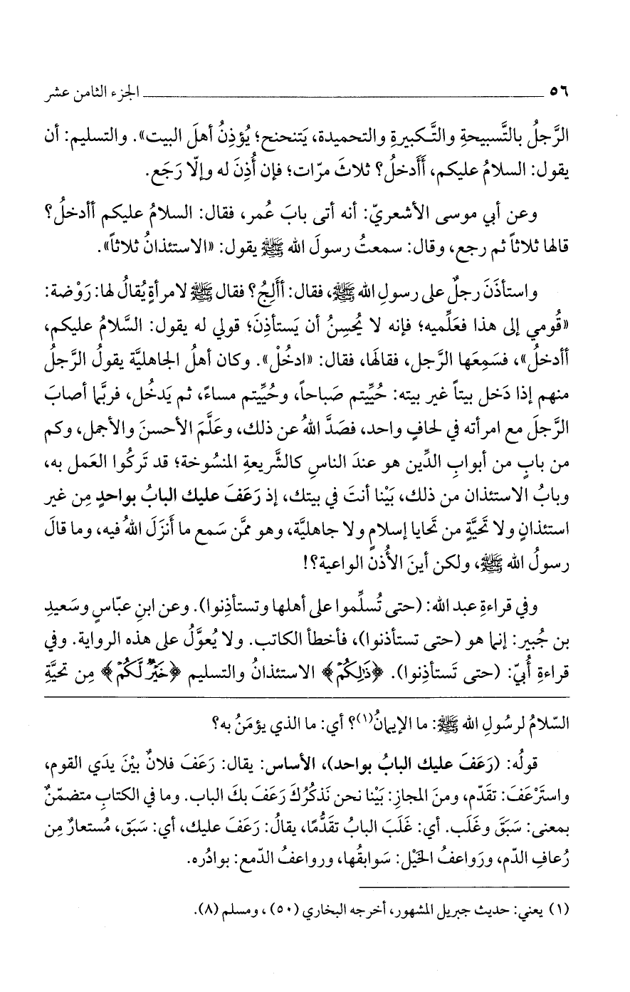 الرجل بالتسبيحة والتكبيرة والتحميدة، يتنحنح، يؤذن أهل البيت". والتسليم: أن يقول: السلام عليكم، أَأَدخل؟ ثلاث مرات، فإن أدن له وإلا رجع.