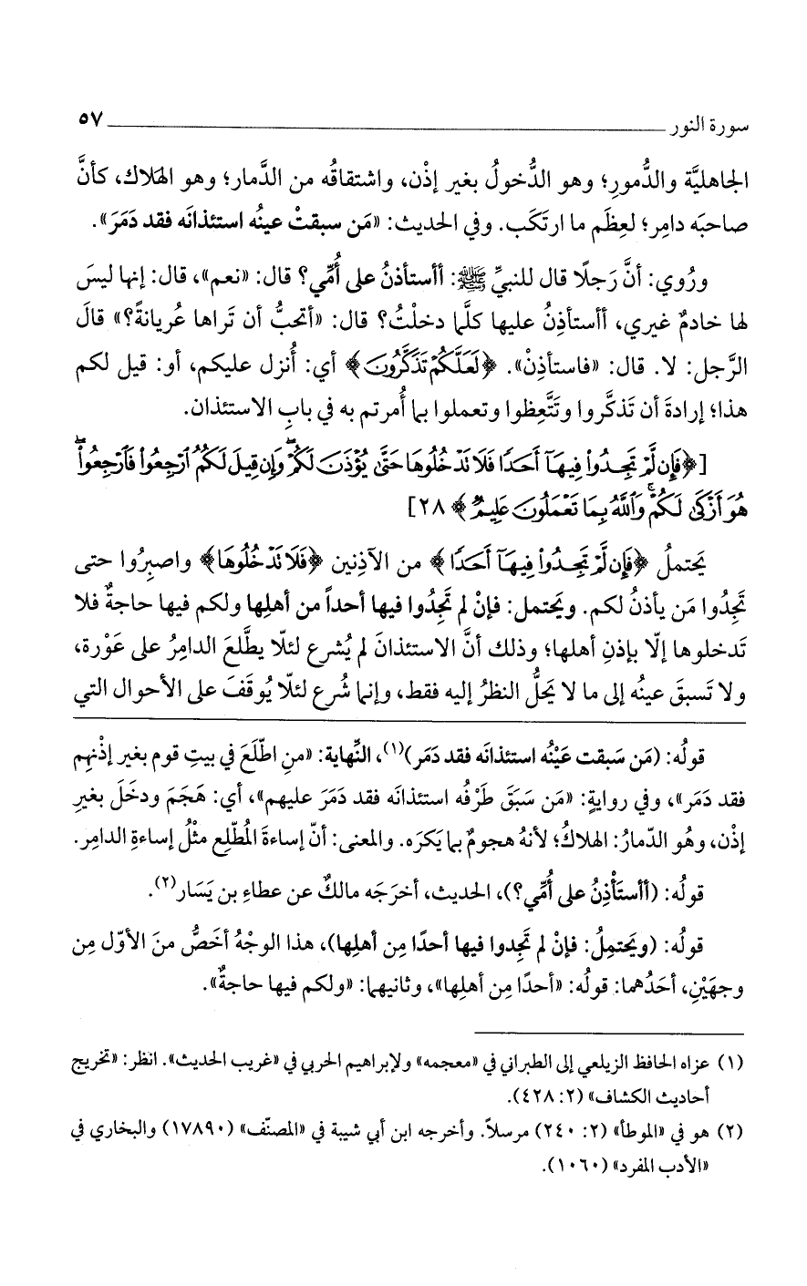 قوله: (من سبقت عينه استئذانه فقد دمر)، النهاية: "من اطلع في بيت قوم بغير إذنهم فقد دمر"، وفي روايةٍ: "من سبق طرفه استئذانه فقد دمر عليهم"، أي: هجم ودخل بغير إذن، وهو الدمار: الهلاك لأنه هجومٌ بما يكره. والمعنى: أن إساءة المطلع مثل إساءة الدامر.