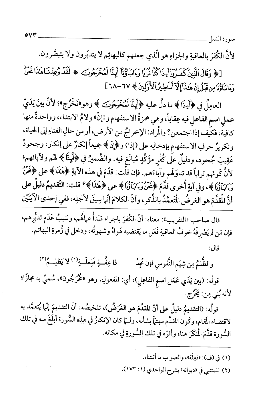 قوله: (التقديم دليلٌ على أن المقدم هو الغرض)، تلخيصه: أن التقديم إنما يتعمد به لاقتضاء المقام، وكون المقدم مهتماً بشأنه، ولما كان الإنكار في هذه السورة أبلغ منه في تلك السورة قدم المنكر هنا، وأقره في تلك السورة في مكانه.