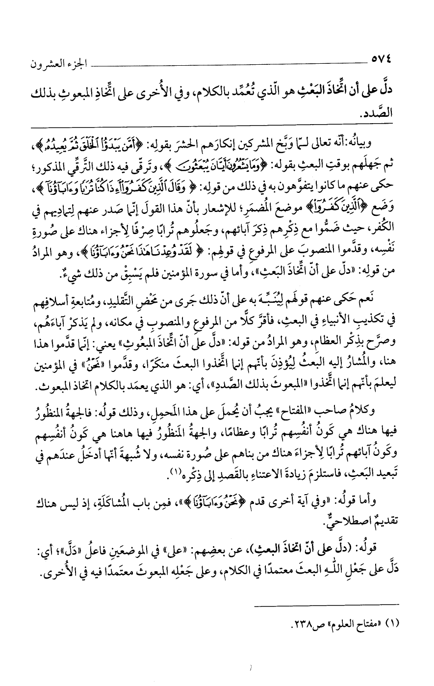 وكلام صاحب "المفتاح" يجب أن يحمل على هذا المحمل، وذلك قوله: فالجهة المنظور فيها هناك هي كون أنفسهم ترابًا وعظامًا، والجهة المنظور فيها هاهنا هي كون أنفسهم وكون آبائهم ترابًا لأجزاء هناك من بناهم على صورة نفسه، ولا شبهة أنها أدخل عندهم في تبعيد البعث، فاستلزم زيادة الاعتناء بالقصد إلى ذكره.