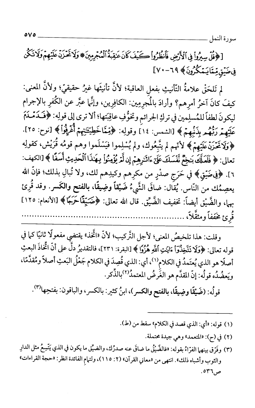 لم تلحق علامة التأنيث بفعل العاقبة، لأنّ تأنيثها غير حقيقي، ولأنّ المعنى: كيف كان آخر أمرهم؟ وأراد بالمجرمين: الكافرين، وإنما عبر عن الكفر الإجرام ليكون لطفا للمسلمين في ترك الجرائم وتخوّف عاقبتها ألا ترى إلى قوله: (فَدَمْدَمَ عَلَيْهِمْ رَبُّهُمْ بِذَنْبِهِمْ) [الشمس: 14] وقوله: (مِمَّا خَطِيئاتِهِمْ أُغْرِقُوا) [نوح: 25]. (وَلا تَحْزَنْ عَلَيْهِمْ) لأنهم لم يتبعوك، ولم يسلموا فيسلموا وهم قومه قريش، كقوله تعالى: (فَلَعَلَّكَ باخِعٌ نَفْسَكَ عَلى آثارِهِمْ إِنْ لَمْ يُؤْمِنُوا بِهذَا الْحَدِيثِ أَسَفاً) [الكهف: 6]. (فِي ضَيْقٍ) في حرج صدر من مكرهم وكيدهم لك، ولا تبال بذلك فإن الله يعصمك من الناس. يقال: ضاق الشيء ضيقا وضيقا، بالفتح والكسر. وقد قرئ بهما. والضيق أيضا: تخفيف الضيق. قال الله تعالى: (ضَيِّقاً حَرَجاً) [الأنعام: 125] قرئ مخففا ومثقلا،