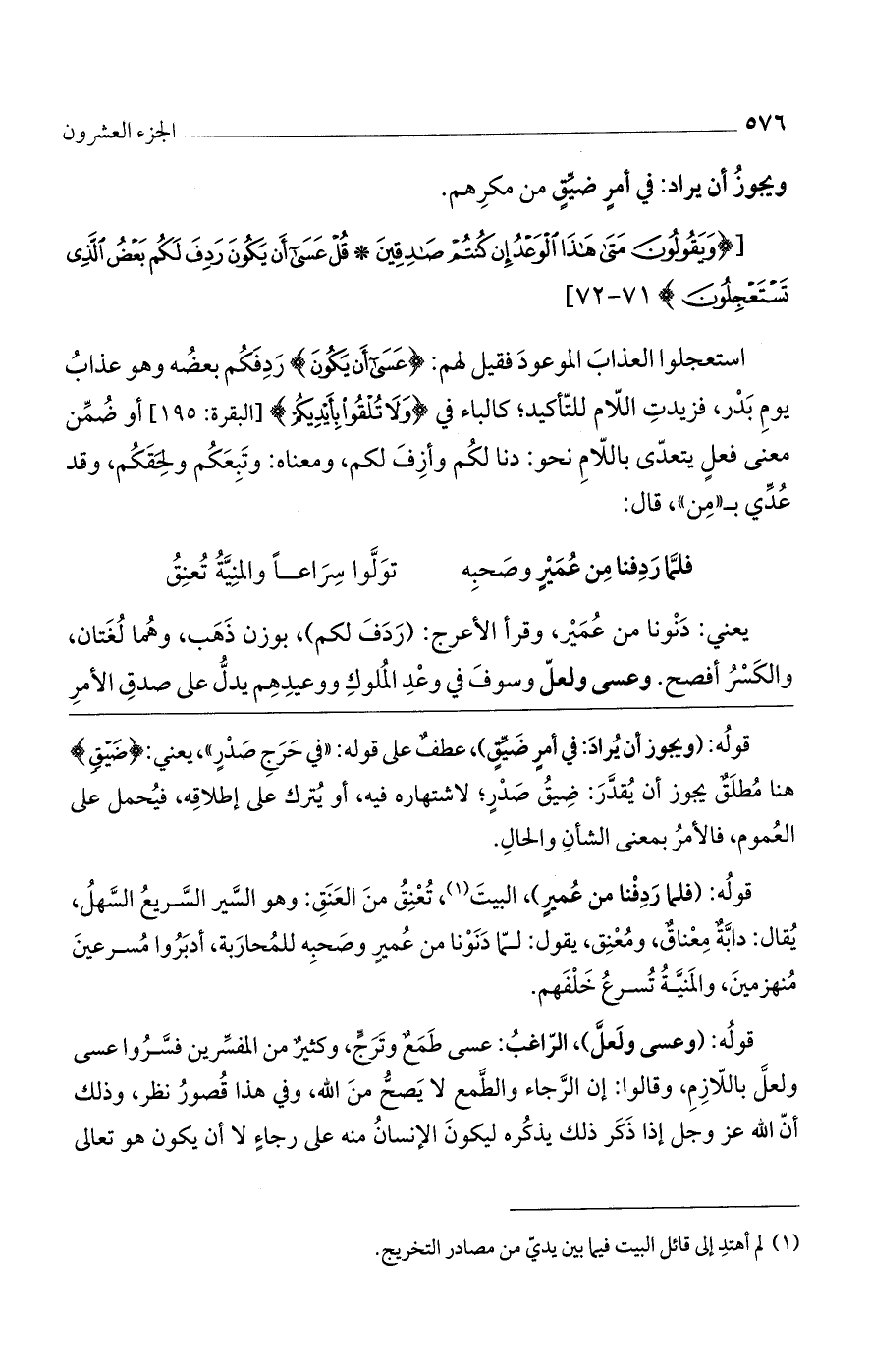 يعني: دنونا من عمير، وقرأ الأعرج: (ردف لكم)، بوزن ذهب، وهما لغتان، والكسر أفصح. وعسى ولعل وسوف في وعد الملوك ووعيدهم يدل على صدق الأمر