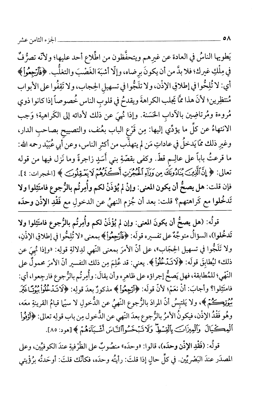 يطويها الناس في العادة عن غيرهم ويتحفظون من اطلاع أحد عليها، ولأنه تصرف في ملك غيرك، فلابد من أن يكون برضاه، وإلا أشبه الغصب والتغلب. {فَارْجِعُوا} أي: لا تلحوا في إطلاق الإذن، ولا تلجوا في تسهيل الحجاب، ولا تقفوا على الأبواب منتظرين، لأن هذا مما يجلب الكراهة ويقدح في قلوب الناس خصوصاً إذا كانوا ذوي مروءة ومرتاضين بالآداب الحسنة. وإذا نهى عن ذلك لأدائه إلى الكراهية، وجب الانتهاء عن كل ما يؤدي إليها: من قرع الباب بعنف، والتصييح بصاحب الدار، وغير ذلك مما يدخل في عادات من لم يتهذب من أكثر الناس، وعن أبي عبيد رحمه الله، ما قرعت باباً على عالمٍ قط. وكفى بقصة بني أسدٍ زاجرةً وما نزل فيها من قوله تعالى: {إِنَّ الَّذِينَ يُنَادُونَكَ مِنْ وَرَاءِ الْحُجُرَاتِ أَكْثَرُهُمْ لَا يَعْقِلُونَ} [الحجرات: 4]. فإن قلت: هل يصح أن يكون xxxx: وإن لم يؤذن لكم وأمرتم بالرجوع فامتثلوا ولا تدخلوا مع كراهتهم؟ قلت: بعد أن جزم النهي عن الدخول مع فقد الإذن وحده