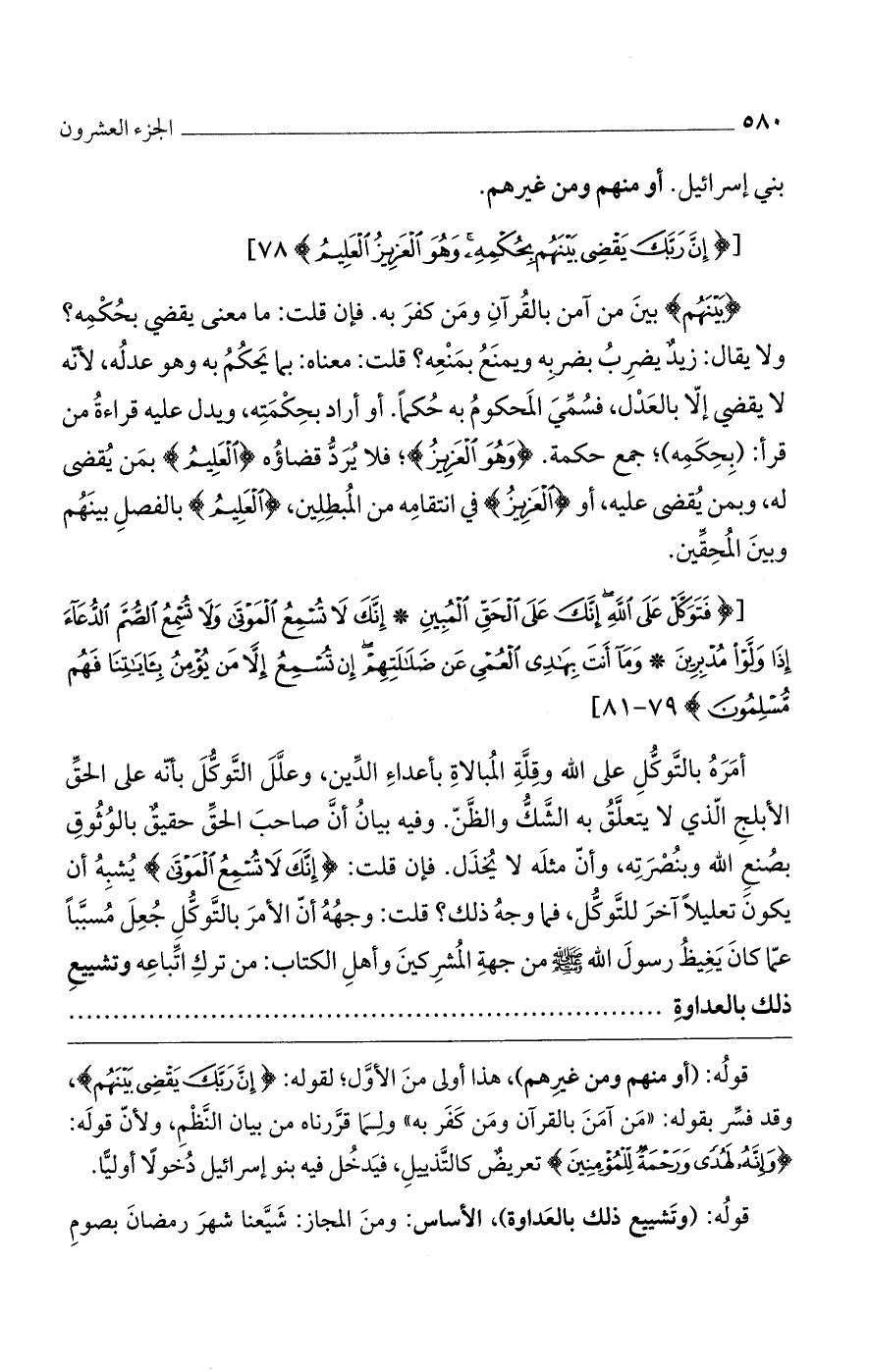 قوله: (أو منهم ومن غيرهم)، هذا أولى من الأول، لقوله: {إِنَّ رَبَّكَ يَقْضِي بَيْنَهُمْ}، وقد فسر بقوله: "من آمن بالقرآن ومن كفر به" ولما قررناه من بيان النظم، ولأن قوله: {وَإِنَّهُ لَهُدًى وَرَحْمَةٌ لِلْمُؤْمِنِينَ} تعريضٌ كالتذييل، فيدخل فيه بنو إسرائيل دخولًا أوليًا.