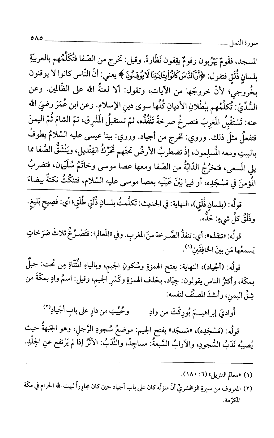 المسجد، فقوم يهربون وقوم يقفون نظارة. وقيل: تخرج من الصفا فتكلمهم بالعربية بلسان ذلق فتقول: (أَنَّ النَّاسَ كانُوا بِآياتِنا لا يُوقِنُونَ) يعني: أن الناس كانوا لا يوقنون بخروجي، لأنّ خروجها من الآيات، وتقول: ألا لعنة الله على الظالمين. وعن السدي: : تكلمهم ببطلان الأديان كلها سوى دين الإسلام. وعن ابن عمر رضي الله عنه: تستقبل المغرب فتصرخ صرخة تنفذه، ثم تستقبل المشرق، ثم الشام ثم اليمن فتفعل مثل ذلك. وروي: تخرج من أجياد. وروي: بينا عيسى عليه السلام يطوف بالبيت ومعه المسلمون، إذ تضطرب الأرض تحتهم تحرك القنديل، وينشق الصفا مما يلي المسعى، فتخرج الدابة من الصفا ومعها عصا موسى وخاتم سليمان، فتضرب المؤمن في مسجده، أو فيما بين عينيه بعصا موسى عليه السلام، فتنكت نكتة بيضاء