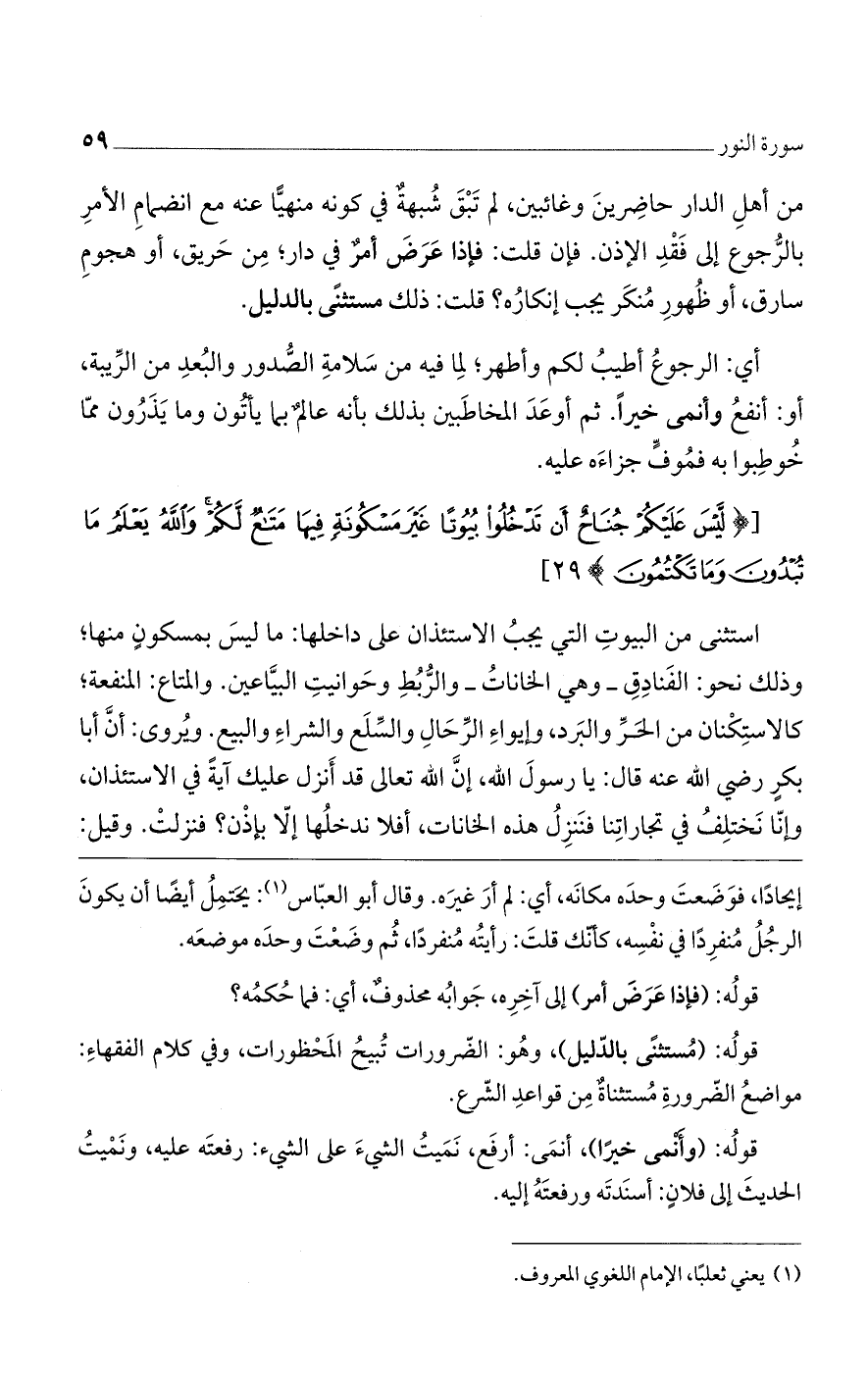 استثنى من البيوت التي يجب الاستئذان على داخلها: ما ليس بمسكونٍ يمنها، وذلك نحو: الفنادق- وهي الخانات- والربط وحوانيت البياعين. والمتاع: المنفعة، كالاستكنان من الحر والبرد، وإيواء الرحال والسلع والشراء والبيع. ويروى: أن أبا بكرٍ رضي الله عنه قال: يا رسول الله، إن الله تعالى قد أنزل عليك آيةً في الاستئذان، وإنا نختلف في تجاراتنا فننزل هذه الخانات، أفلا ندخلها إلا بإذن؟ فنزلت. وقيل: