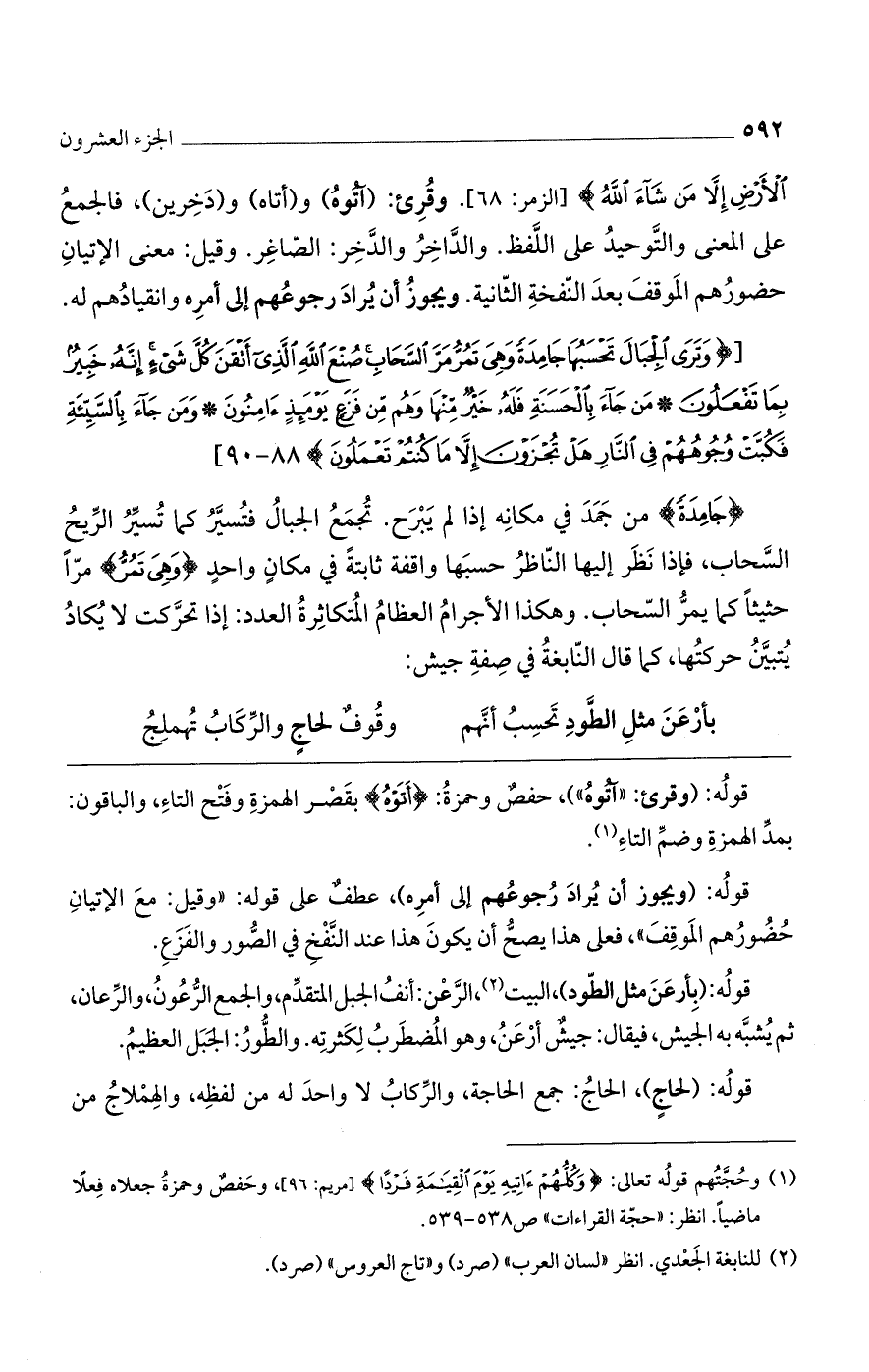 (جَامِدَةً) من جمد في مكانه إذا لم يبرح. تجمع الجبال فتسير كما تسير الريح السحاب، فإذا نظر إليها الناظر حسبها واقفه ثابتة في مكان واحد (وَهِيَ تَمُرُّ) مرّا حثيثا كما يمر السحاب. وهكذا الأجرام العظام المتكاثرة العدد: إذا تحرّكت لا تكاد تتبين حركتها، كما قال النابغة في صفة جيش: