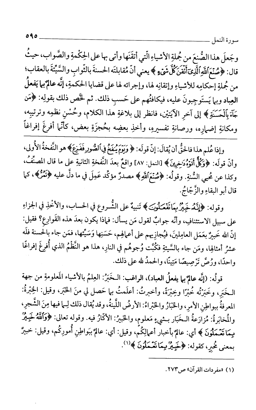 وإذا علم هذا فالحق أن يقال: إن قوله: {وَيَوْمَ يُنْفَخُ فِي الصُّورِ فَفَزِعَ} هو النفخة الأولى، وأن قوله: {وَكُلٌّ أَتَوْهُ دَاخِرِينَ} [النمل: 87] واقعٌ بعد النفخة الثانية على ما قال المصنف، وكذا عن محيي السنة. وقوله: {صُنْعَ اللَّهِ} مصدرٌ مؤكد عمل في ما دل عليه {تَمُرُّ}، كما قال أبو البقاء والزجاج.