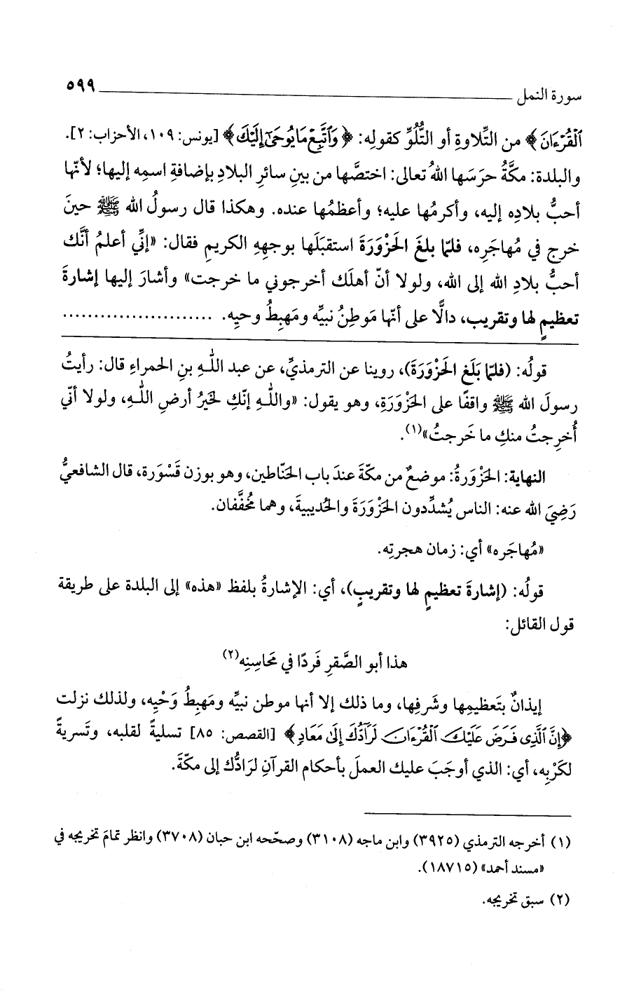 إيذانٌ بتعظيمها وشرفها، وما ذلك إلا أنها موطن نبيه ومهبط وحيه، ولذلك نزلت {إِنَّ الَّذِي فَرَضَ عَلَيْكَ الْقُرْآَنَ لَرَادُّكَ إِلَى مَعَادٍ} [القصص: 85] تسليةً لقلبه، وتسريةً لكربه، أي: الذي أوجب عليك العمل بأحكام القرآن لرادك على مكة.