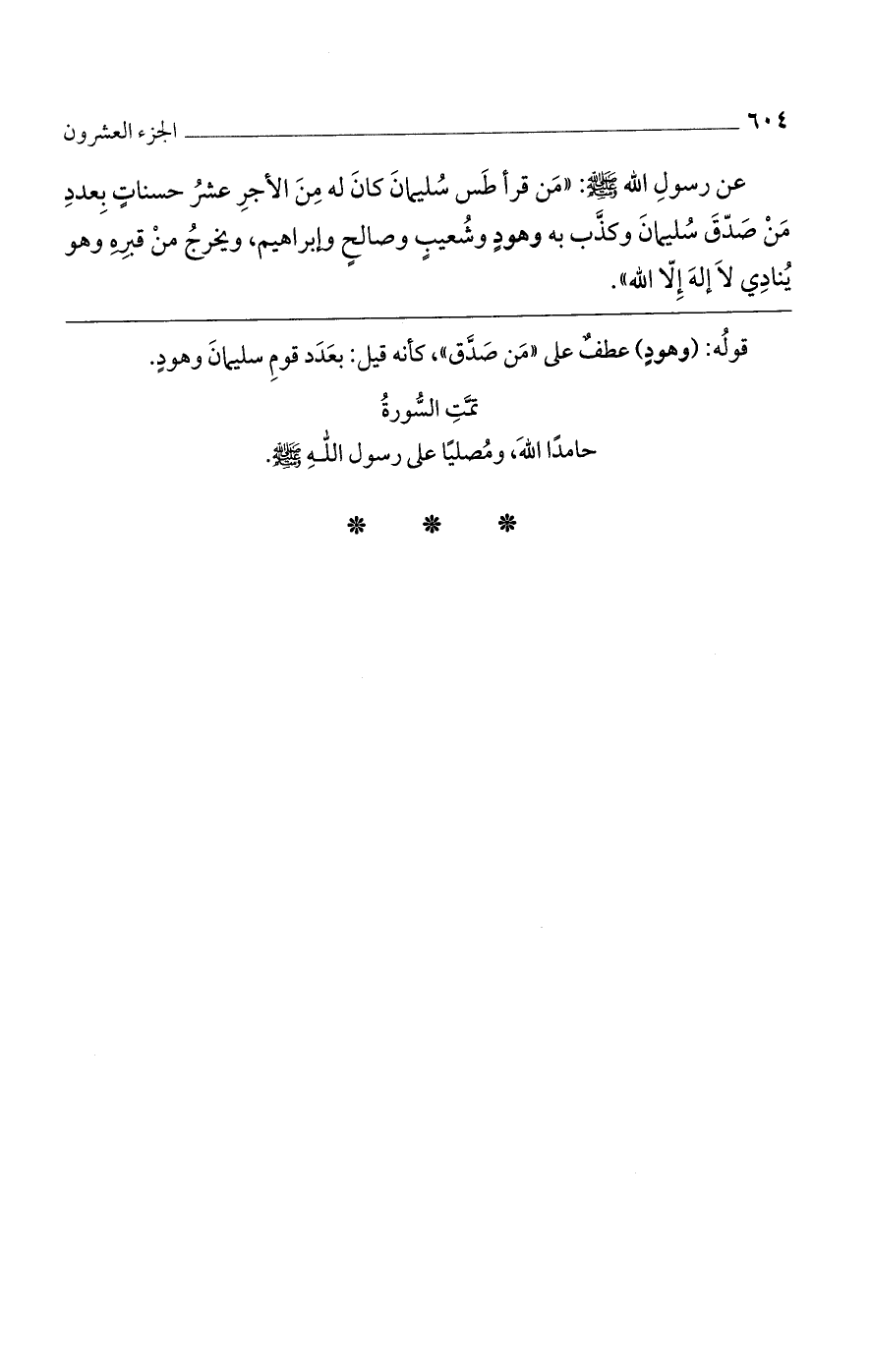عن رسول الله صلى الله عليه وسلم: "من قرأ طس سليمان كان له من الأجر عشر حسنات بعدد من صدّق سليمان وكذب به وهود وشعيب وصالح وإبراهيم، ويخرج من قبره وهو ينادي لا إله إلا الله".