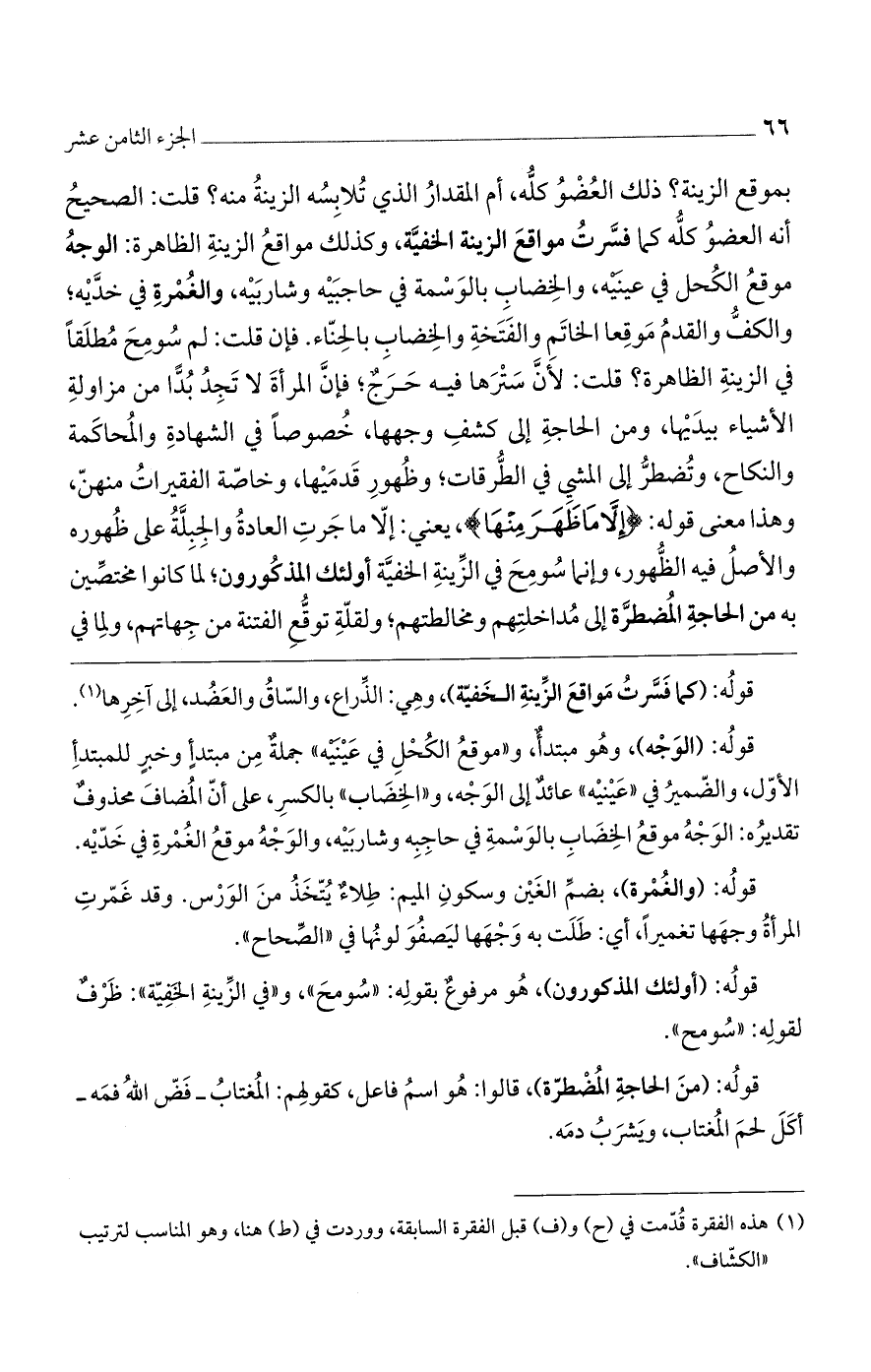 بموقع الزينة؟ ذلك العضو كله. أم المقدار الذي تلابسه الزينة منه؟ قلت: الصحيح أنه العضو كله كما فسرت مواقع الزينة الخفية، وكذلك مواقع الزينة الظاهرة: الوجه موقع الكحل في عينيه، والخضاب بالوسمة في حاجبيه وشاربه، والغمرة في حديه، والكف والقدم موقعاً الخاتم و xxxx والخضاب بالحناء. فإن قلت لم xxxx مطلقاً في الزينة الظاهرة؟ قلت: لأن xxxx فيه حرج، فإن المرأة لا xxxx من مزاولة الأشياء بيديها، ومن الحاجة إلى كشف وجهها، خصوصاً في الشهادة والمحاكمة والنكاح، وتضطر إلى المتنبي في الطرقات، وظهور قدميها، وخاصة الفقيرات منهن، وهذا معنى قوله: {إِلَّا مَا ظَهَرَ مِنْهَا}، يعني: إلا ما رجت العادة والجبلة على ظهوره والأصل فيه الظهور، وإنما xxxx في الزينة الخفية أولئك المذكورون لما كانوا مختصين به من الحاجة المضطر، إلى مداخلتهم ومخالطتهم، ولقلة توقع الفتنة من جهاتهم، ولما في