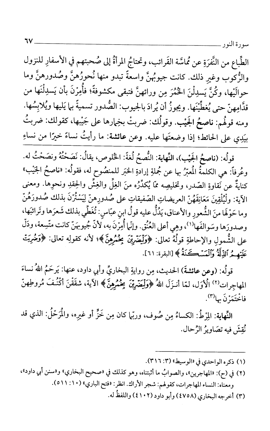 الطباع من النفرة عن مماسة القرائب، وتحتاج المرأة إلى صحبتهم في الأسفار للنزول والركوب وغير ذلك. كانت جيوبهن واسعةً تبدو منها نحورهن وصدورهن وما حواليها، وكن يسدلن الخمر من ورائهن فتبقى مكشوفةٌ، فأمرن بأن يسدلنها من قدامهن حتى يغطينها. ويجوز أن يراد بالجيوب: الصدور تسميةً بما يليها ويلابسها. ومنها قولهم: ناصح الجيب، وقولك: ضربت بخمارها على جيبها، كقولك: ضربت بيدي على الحائط، إذا وضعتها عليه. وعن عائشة: ما رأيت نساء خيرًا من نساء
