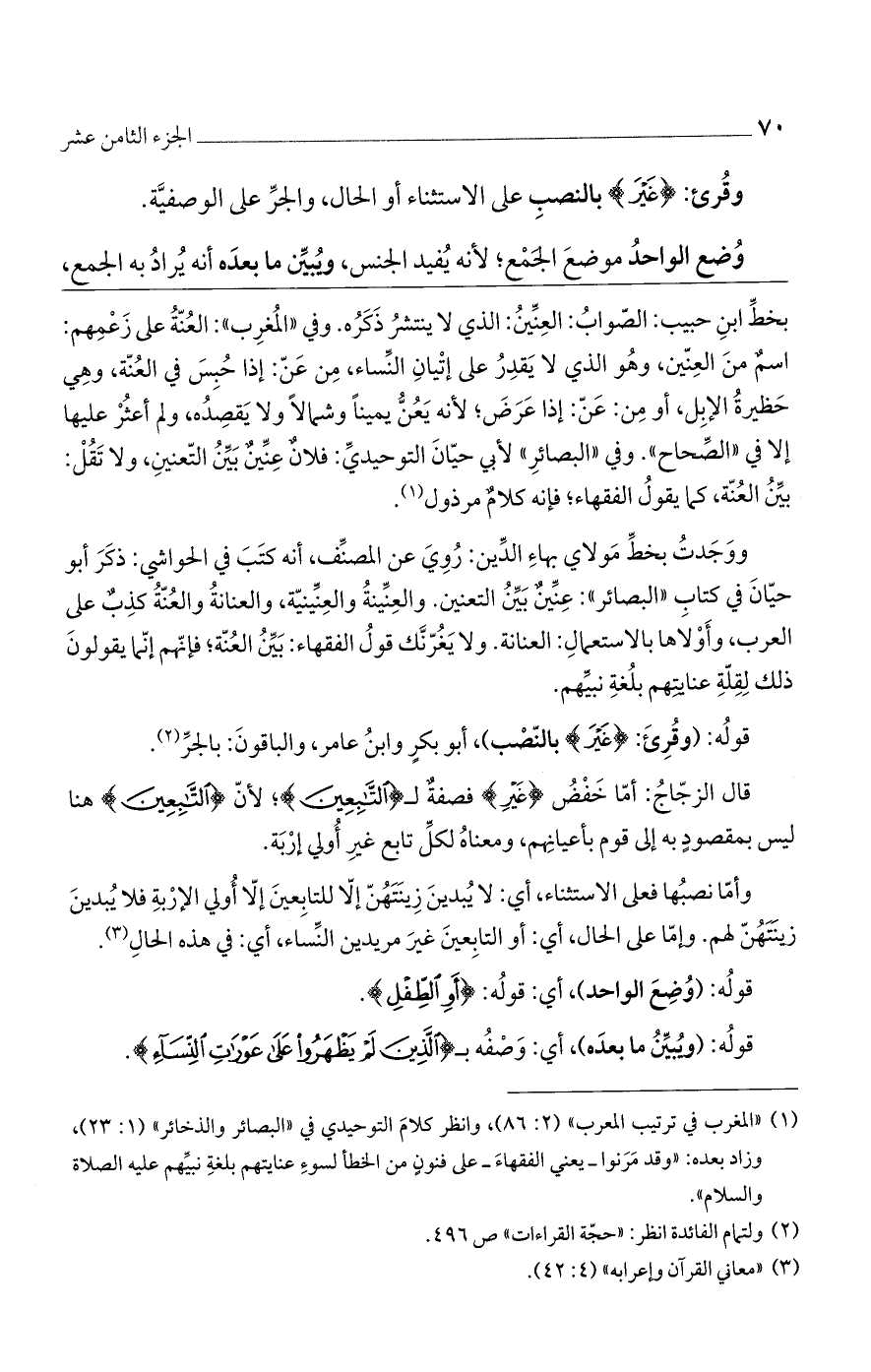 قال الزجاج: أما {غَيرَ} فصفةٌ لـ {التَّابِعِينَ}، لأن {التَّابِعِينَ} هنا ليس بمقصود به إلى قوم بأعيانهم، xxxx لكل تابع غير أولي إربة.