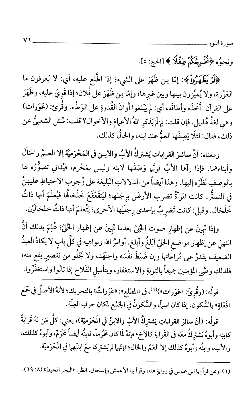 ومعناه: أن سائر القرابات بشترك الأب والابن في المحرمية إلا العم والخال وأبناءهما. فإذا رآها الأب xxxx وصفها لابنه وليس بمحرم. فيداني تصوره لها بالوصف نظره إليها. وهذا أيضاً من الدلالات البليغة على وجوب الاحتياط عليهن في التستر. كانت المرأة تضرب الأرض برجلها، ليتقعقع خلخالها فيعلم أنها ذات خلخال. وقيل: كانت تضرب بإحدى رجليها الأخرى، لتعلم أنها ذات طحالين.