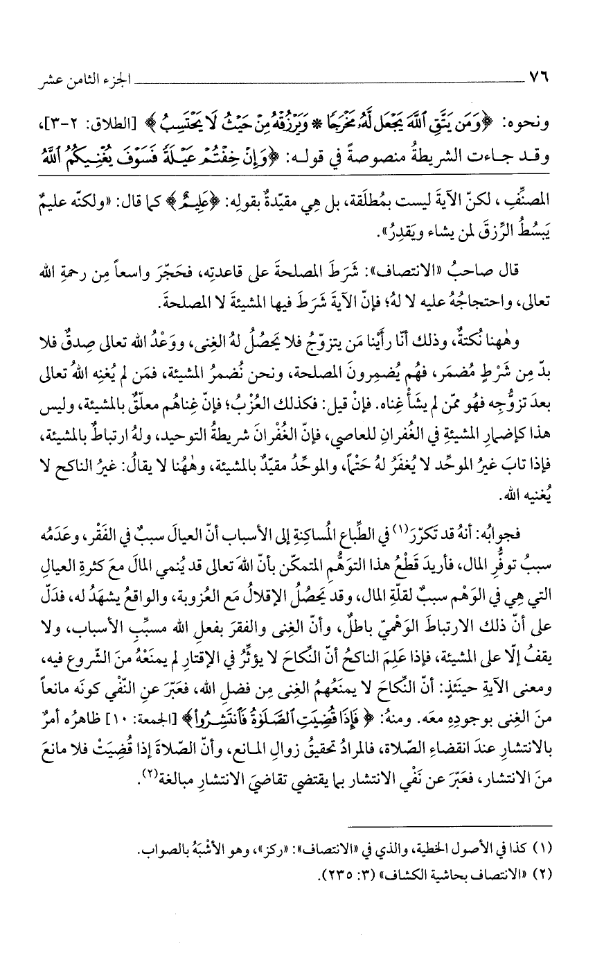 ونحوه: {وَمَنْ يَتَّقِ اللَّهَ يَجْعَلْ لَهُ مَخْرَجًا (2) وَيَرْزُقْهُ مِنْ حَيْثُ لَا يَحْتَسِبُ} [الطلاق: 2 - 3]، وقد جاءت الشريطة منصوصةً في قوله: {وَإِنْ خِفْتُمْ عَيْلَةً فَسَوْفَ يُغْنِيكُمُ اللَّهُ