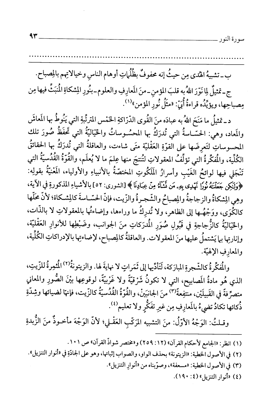 والمفكرة كالشجرة المباركة، لتأديها إلى ثمرات لا نهاية لها. والزيتونة المثمرة للزيت الذي هو مادة المصابيح، التي لا تكون شرقيةً ولا غربيةً، لوقوعها بين الصور والمعاني متصرفةً في القبيلين، منتفعة من الجانبين، والقوة القدسية كالزيت، فإنها لضيائها وشدة ذكائها تكاد تضيء بالمعارف من غير تفكرٍ ولا تعليم.