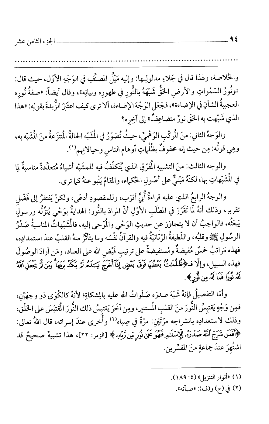 والخلاصة، ولهذا قال في جلاء مدلولها: وإليه ميل المصنف في الوجه الأول، حيث قال: "ونور السموات والأرض الحق شبهه بالنور في ظهوره وبيانه"، وقال أيضاً: "صفة نوره العجيبة الشأن في الإضاءة"، فجعل الوجه الإضاءة، ألا ترى كيف اعتبر الزبدة بقوله: "هذا الذي شبهت به الحق نورٌ متضاعفٌ" إلى آخره؟