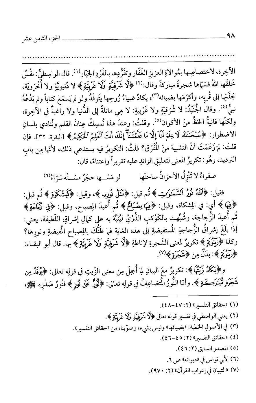 الآخرة، لاختصاصها بموالاة العزيز الغفار وتفردها بالفرد الجبار. قال الواسطي: نفسٌ خلقها الله فسماها شجرةً مباركةً وقال: {لَا شَرْقِيَّةٍ وَلَا غَرْبِيَّةٍ} لا دنيويةٍ ولا أخروية، جذبها إلى قربه، وأكرمها بضيائه، يكاد ضياء روحها يتوقد ولو لم يسمع كتاباً ولم يدعه نبيٌ. وقال الجنيد: لا شرقيةٍ ولا غربيةٍ: لا هي مائلةٌ إلى الدنيا ولا راغبةٌ في الآخرة، ولكنها فانية الحظ من الأكوان. وقلت: وعند هذا نمسك عنان القلم وننادي بلسان الاضطرار: {سُبْحَانَكَ لَا عِلْمَ لَنَا إِلَّا مَا عَلَّمْتَنَا إِنَّكَ أَنْتَ الْعَلِيمُ الْحَكِيمُ} [البقرة: 32] فإن قلت: لم زعمت أن التشبيه من المفرق؟ قلت: التكرير فيه يستدعي ذلك، لأنها من باب الترديد، وهو: تكرير المعنى لتعليق الزائد عليه تقريراً واعتناءً، قال: