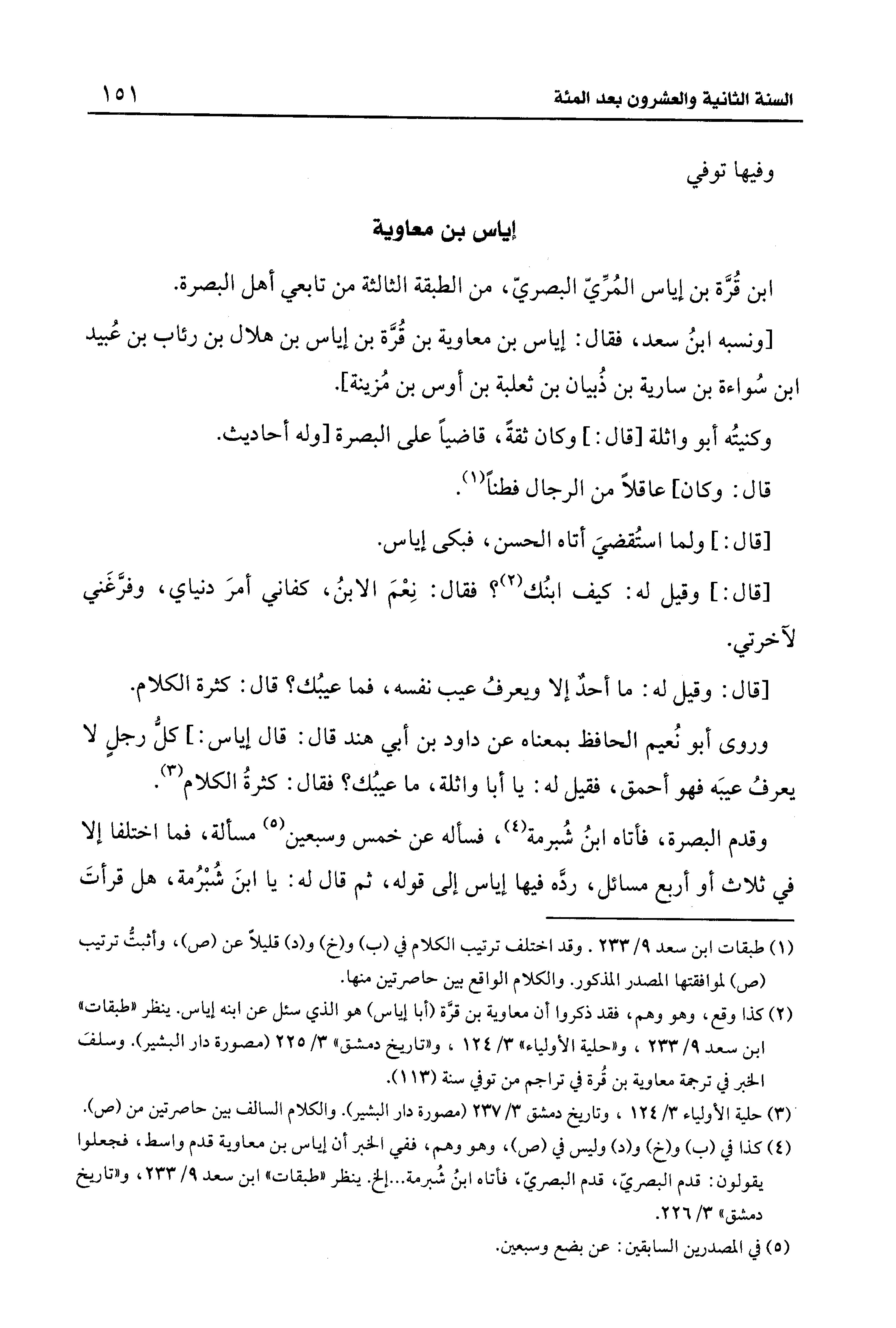 (¬2) كذا وقع، وهو وهم، فقد ذكروا أن معاوية بن قرَّة (أَبا إياس) هو الذي سئل عن ابنه إياس. ينظر "طبقات" ابن سعد 9/ 233، و"حلية الأولياء" 3/ 124، و"تاريخ دمشق" 3/ 225 (مصورة دار البشير). وسلفَ الخبر في ترجمة معاوية بن قُرة في تراجم من تُوفِّي سنة (113).