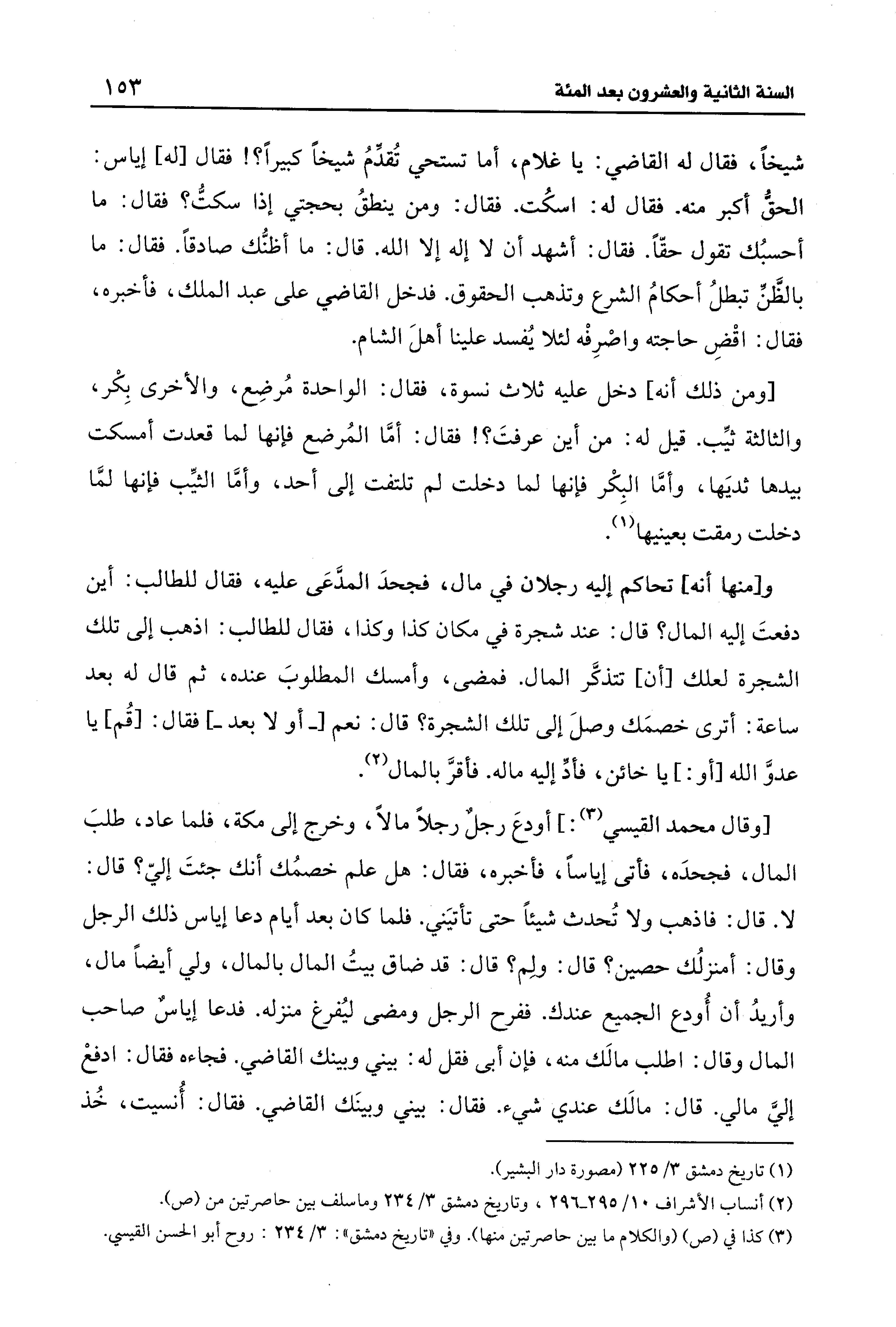 شيخًا، فقال له القاضي: يَا غلام، أما تستحي تُقدِّمُ شيخًا كبيرًا؟ ! فقال [له] إياس: الحقُّ أكبر منه. فقال له: اسكُت. فقال: ومن ينطقُ بحجتي إذا سكتُّ؟ فقال: ما أحسبُك تقول حقًّا. فقال: أشهد أن لا إله إلَّا الله. قال: ما أظنُّك صادقًا. فقال: ما بالظَّنِّ تبطلُ أحكامُ الشرع وتذهب الحقوق. فدخل القاضي على عبد الملك، فأخبره، فقال: اقْضِ حاجته واصْرِفْه لئلا يُفسد علينا أهلَ الشَّام.