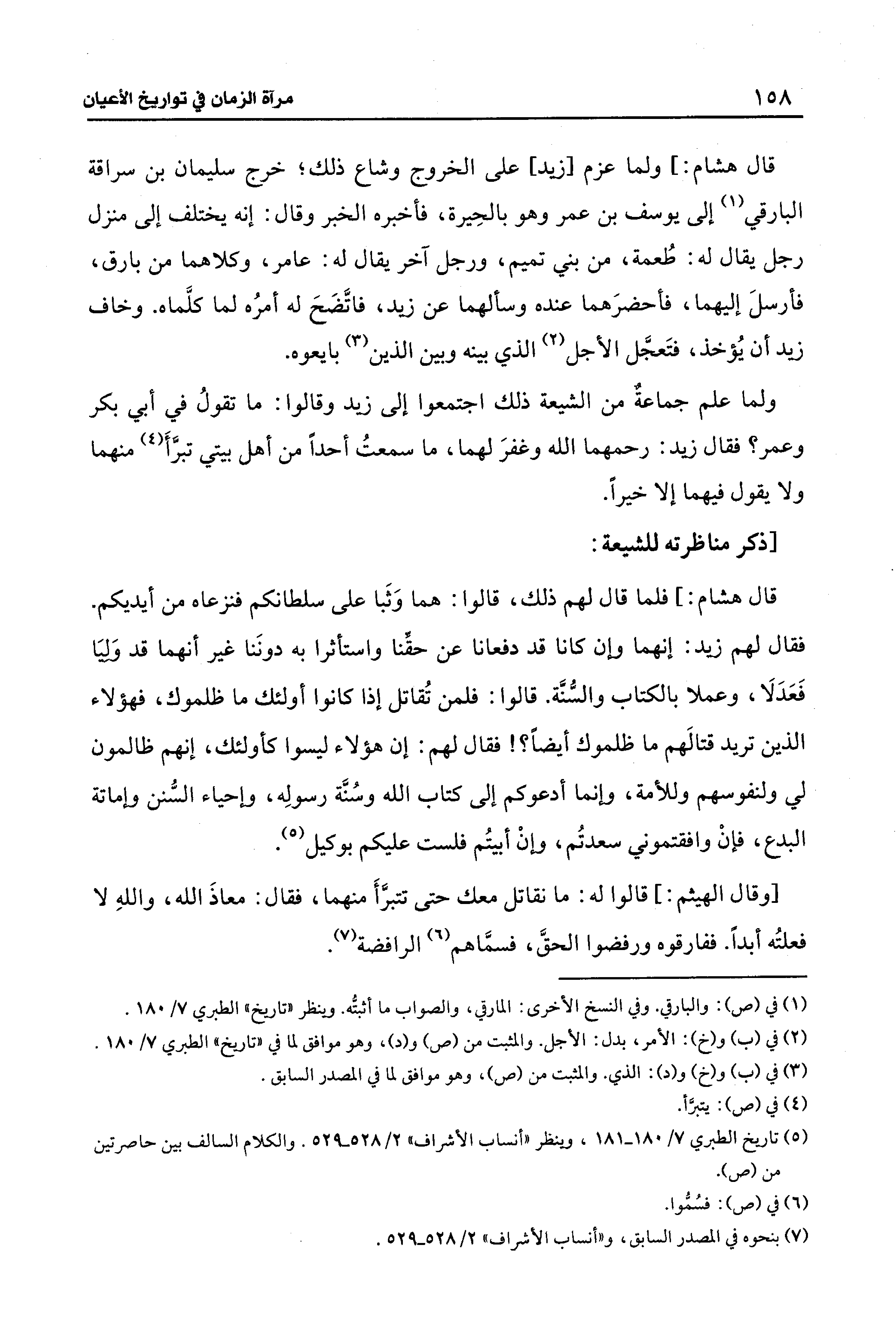 ولما علم جماعةٌ من الشيعة ذلك اجتمعوا إلى زيد وقالوا: ما تقولُ في أبي بكر وعمر؟ فقال زيد: رحمهما الله وغفرَ لهما، ما سمعتُ أحدًا من أهل بيتي تبرَّأَ (¬4) منهما ولا يقول فيهما إلَّا خيرًا.