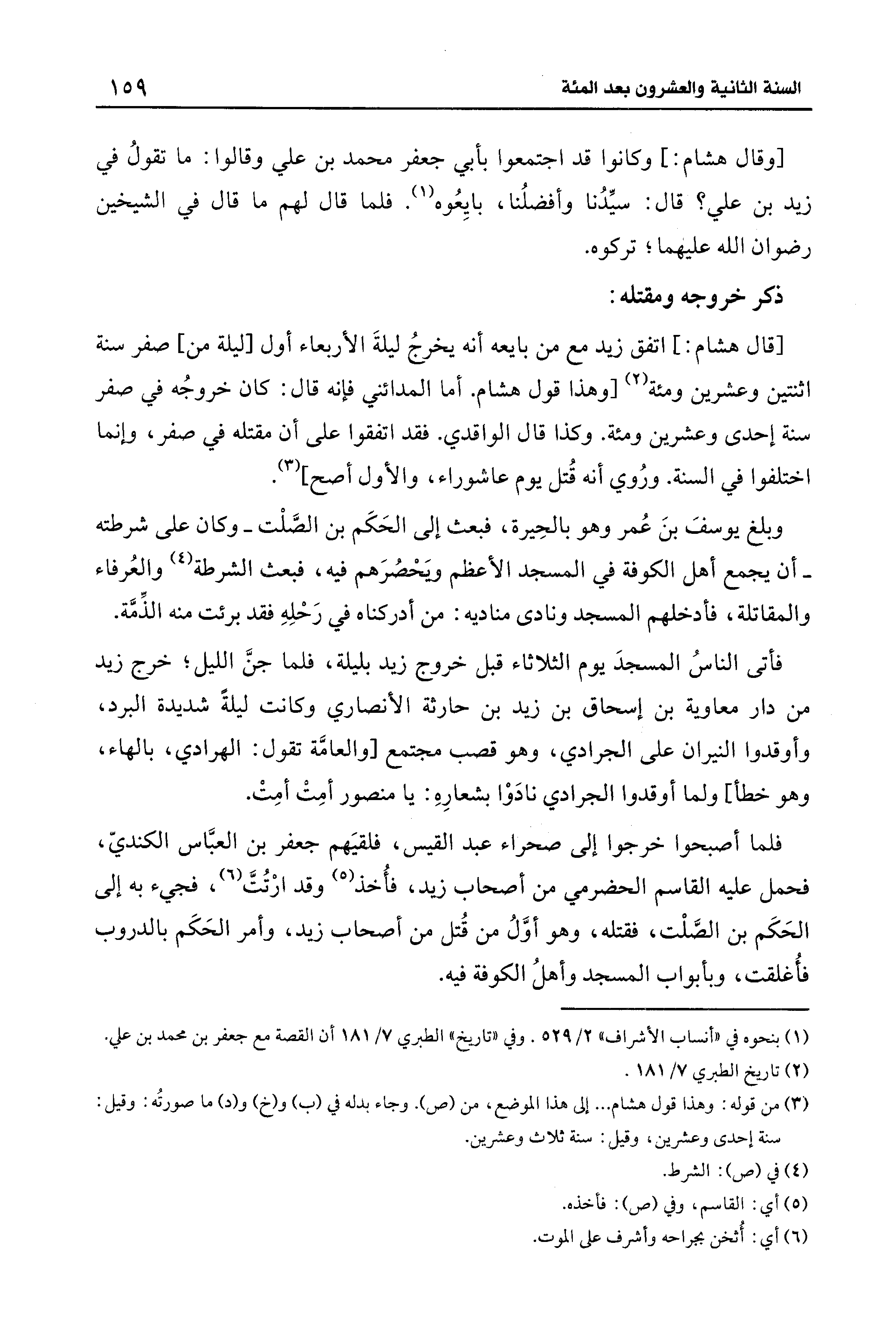 [قال هشام: ] اتفق زيد مع من بايعه أنَّه يخرجُ ليلةَ الأربعاء أول [ليلة من] صفر سنة اثنتين وعشرين ومئة (¬2) [وهذا قول هشام. أما المدائنيّ فإنَّه قال: كان خروجُه في صفر سنة إحدى وعشرين ومئة. وكذا قال الواقدي. فقد اتفقوا على أن مقتله في صفر، وإنما اختلفوا في السنة. ورُوي أنَّه قُتل يوم عاشوراء، والأول أصح] (¬3).