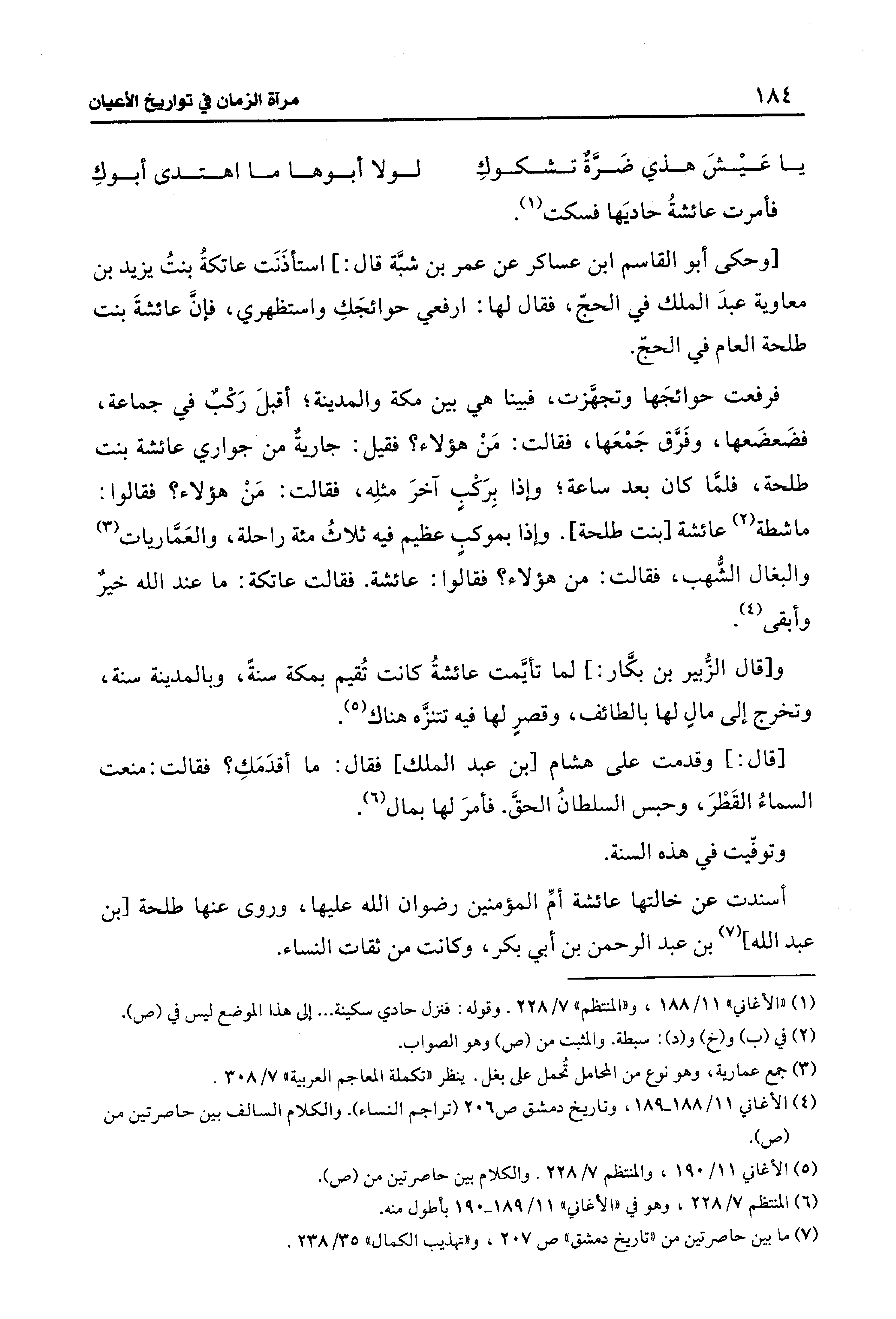 فرفعت حوائجَها وتجهَّزت، فبينا هي بين مكة والمدينة؛ أقبلَ رَكْبٌ في جماعة، فضَعضَعها، وفَرَّق جَمْعَها، فقالت: مَنْ هؤلاء؟ فقيل: جارية من جواري عائشة بنت طلحة، فلمَّا كان بعد ساعة؛ وإذا بِرَكْبٍ آخرَ مثلِه، فقالت: مَنْ هؤلاء؟ فقالوا: ماشطة (¬2) عائشة [بنت طلحة]. وإذا برَكْبٍ عظيم فيه ثلاثُ مئة راحلة، والعَمَّاريات (¬3) والبغال الشُّهب، فقالت: من هؤلاء؟ فقالوا: عائشة. فقالت عاتكة: ما عند الله خيرٌ وأبقى (¬4).