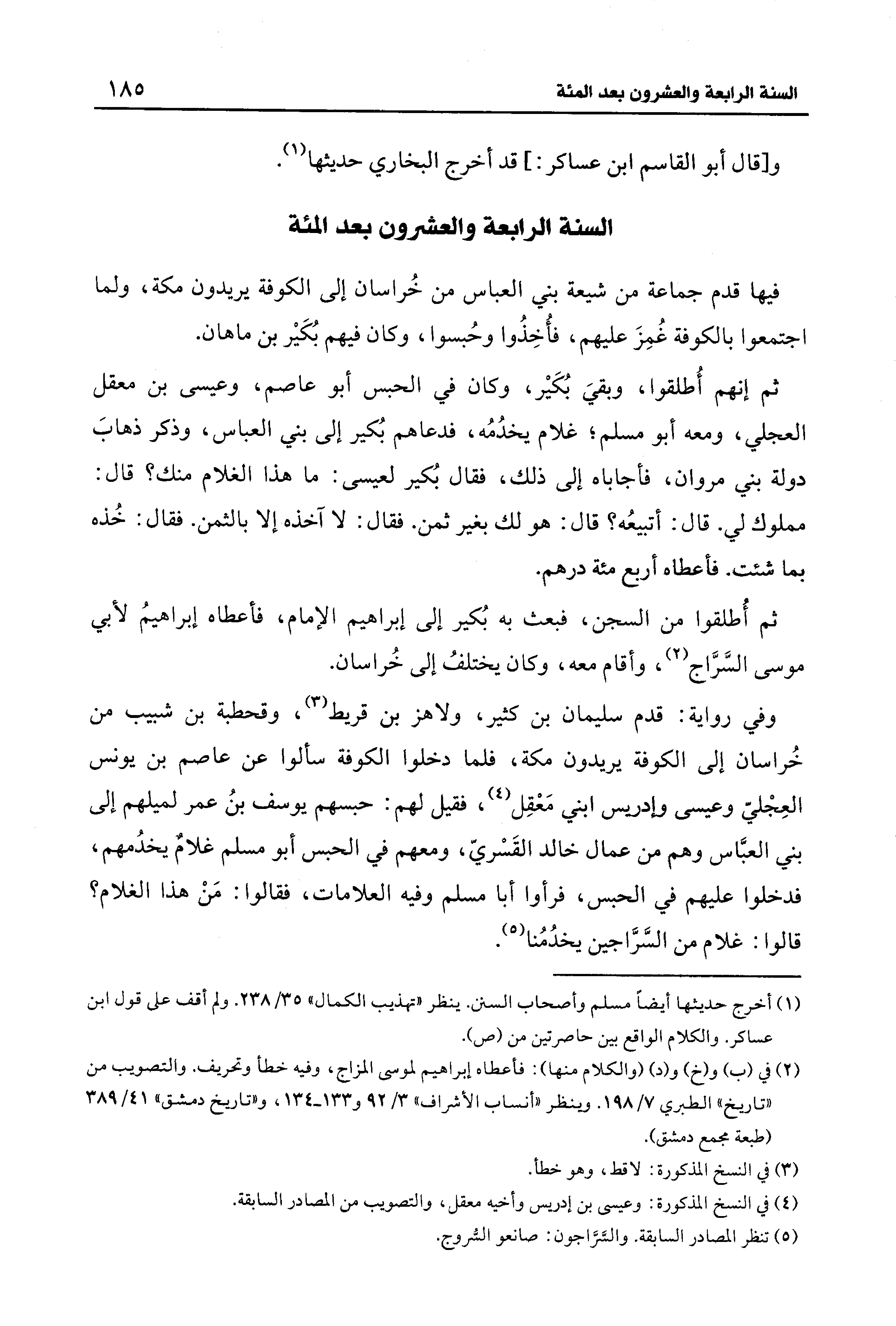 وفي رواية: قدم سليمان بن كثير، ولاهز بن قريط (¬3)، وقحطبة بن شبيب من خُراسان إلى الكوفة يريدون مكة، كما دخلوا الكوفة سألوا عن عاصم بن يونس العِجْليّ وعيسى وإدريس ابني مَعْقِل (¬4)، فقيل لهم: حبسهم يوسف بنُ عمر لميلهم إلى بني العبَّاس وهم من عمال خالد القَسْريّ، ومعهم في الحبس أبو مسلم غلامٌ يخدُمهم، فدخلوا عليهم في الحبس، فرأوا أَبا مسلم وفيه العلامات، فقالوا: مَنْ هذا الغلام؟ قالوا: غلام من السرَّاجين يخدُمُنا (¬5).