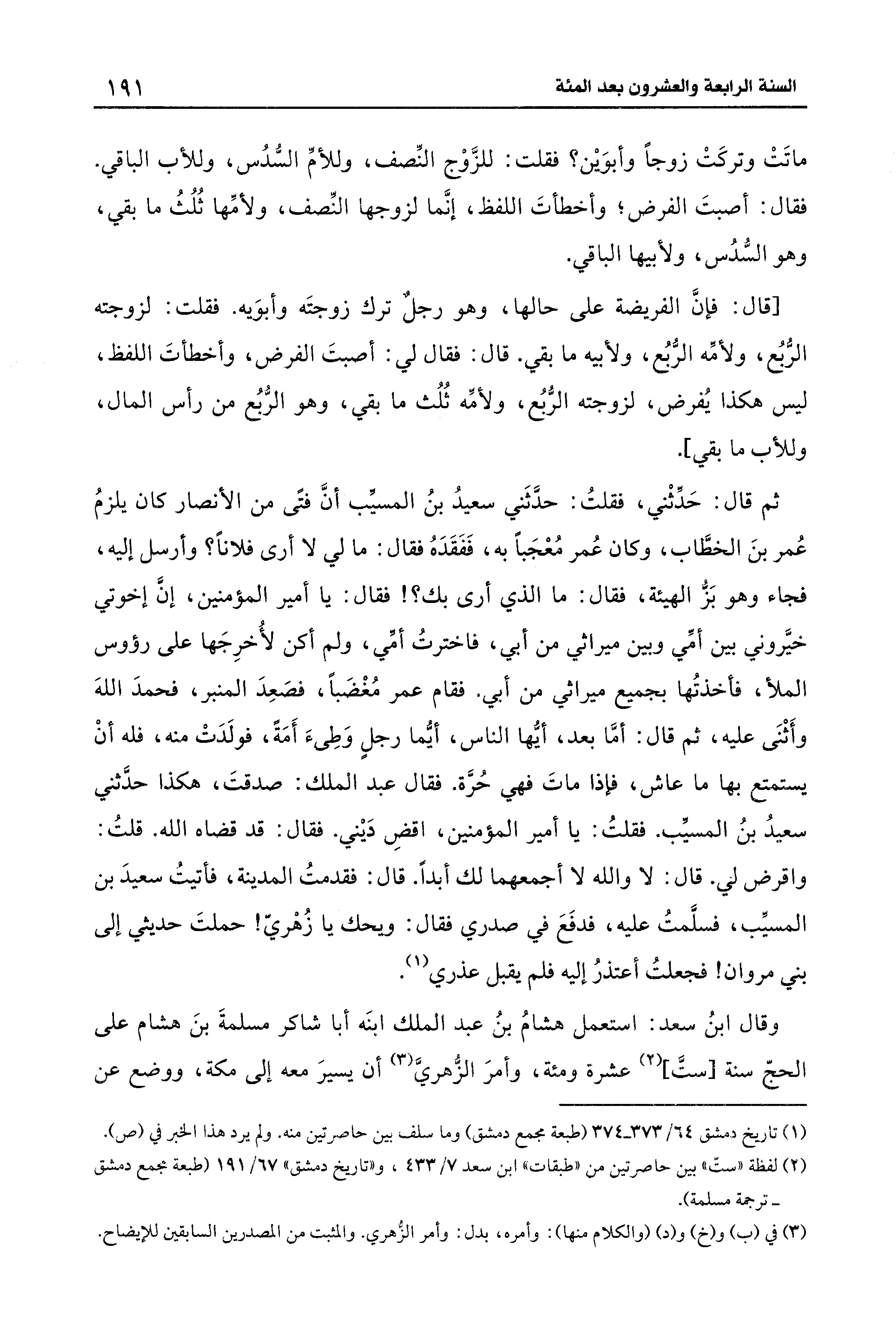 [قال: فإنَّ الفريضة على حالها، وهو رجلٌ ترك زوجتَه وأبوَيه. فقلت: لزوجته الرُّبُع، ولأمِّه الرُّبُع، ولأبيه ما بقي. قال: فقال لي: أصبتَ الفرض، وأخطأتَ اللفظ، ليس هكذا يُفرض، لزوجته الرُّبُع، ولأمِّه ثُلُث ما بقي، وهو الرُّبُع من رأس المال، وللأب ما بقي].