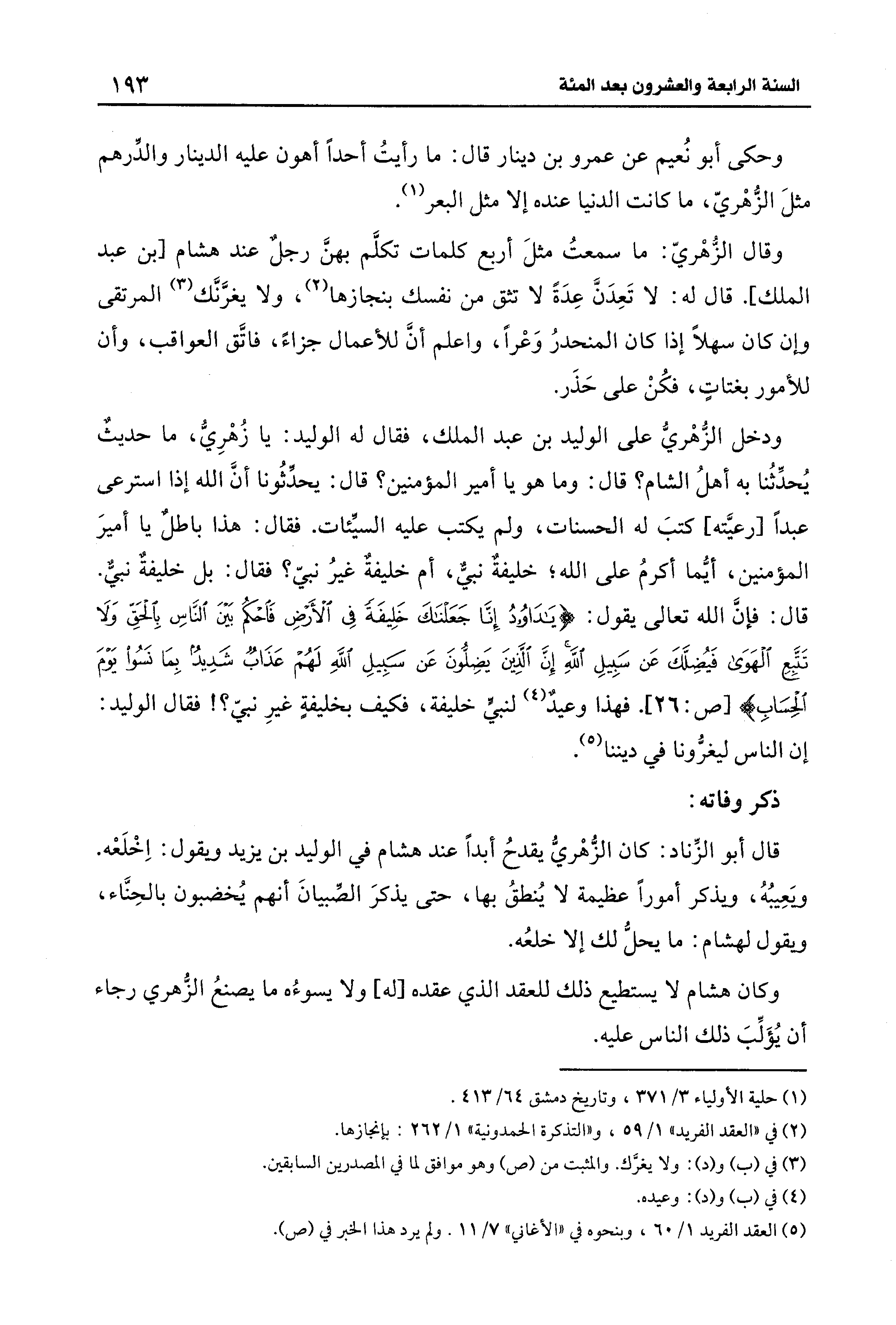 قال أبو الزِّناد: كان الزُّهْريُّ يقدحُ أبدًا عند هشام في الوليد بن يزيد ويقول: اِخْلَعْه. ويَعِيبُهُ، ويذكر أمورًا عظيمة لا يُنطقُ بها، حتَّى يذكرَ الصِّبيانَ أنَّهم يُخضبون بالحِنَّاء، ويقول لهشام: ما يحلُّ لك إلَّا خلعُه.
