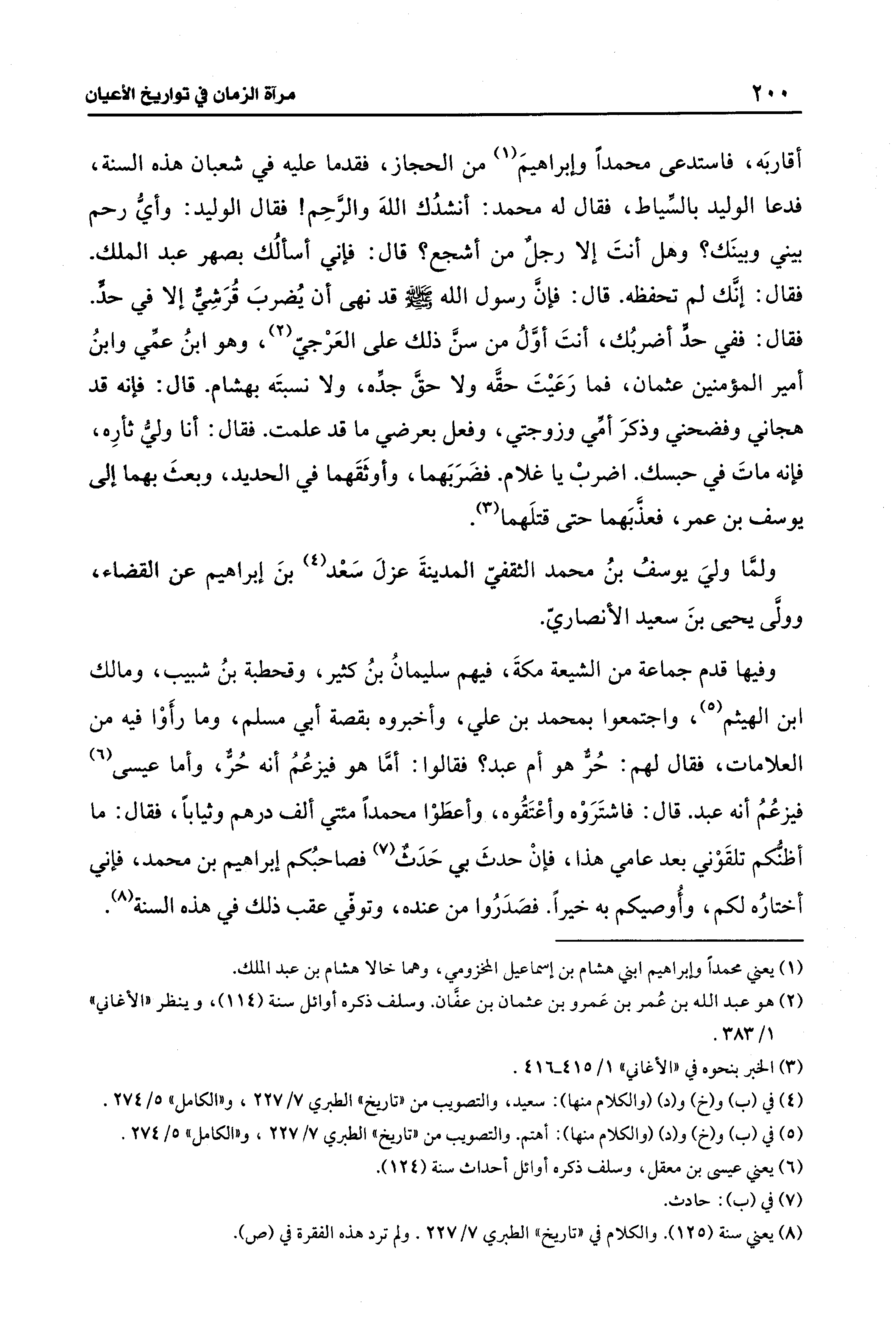 وفيها قدم جماعة من الشيعة مكةَ، فيهم سليمانُ بنُ كثير، وقحطبة بنُ شبيب، ومالك بن الهيثم (¬5)، واجتمعوا بمحمد بن عليّ، وأخبروه بقصة أبي مسلم، وما رأَوْا فيه من العلامات، فقال لهم: حُرٌّ هو أم عبد؟ فقالوا: أمَّا هو فيزعُمُ أنَّه حُرٌّ، وأما عيسى (¬6) فيزعُمُ أنَّه عبد. قال: فاشتَرَوْه وأعْتَقُوه، وأعطَوْا محمدًا مئتي أَلْف درهم وثيابًا، فقال: ما أظنُّكم تلقَوْني بعد عامي هذا، فإنْ حدثَ بي حَدَثٌ (¬7) فصاحبُكم إبراهيم بن محمَّد، فإنِّي أختارُه لكم، وأُوصيكم به خيرًا. فصَدَرُوا من عنده، وتوفّي عقب ذلك في هذه السنة (¬8).