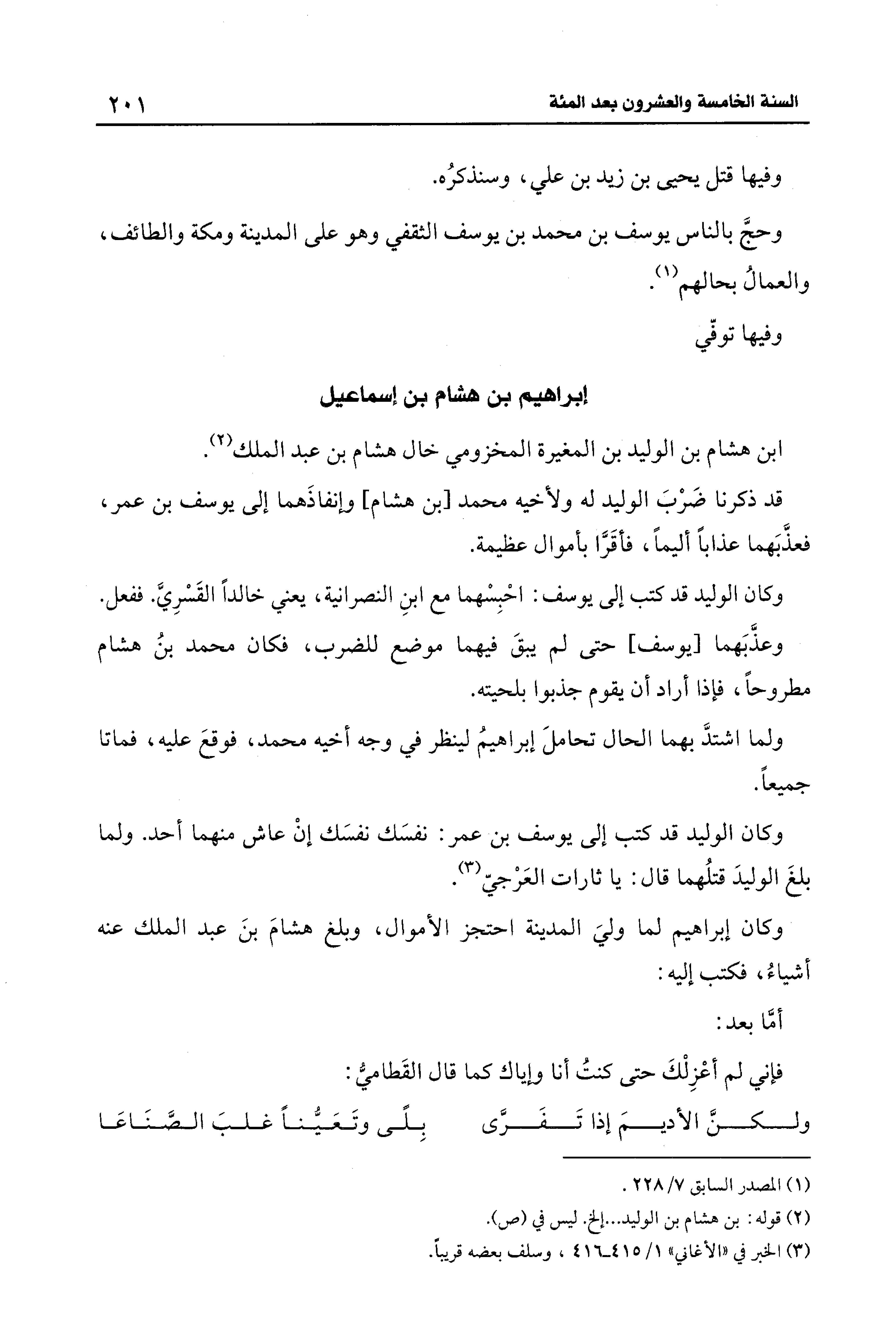 وكان الوليد قد كتب إلى يوسف بن عمر: نفسَك نفسَك إنْ عاش منهما أحد. ولما بلغَ الوليدَ قتلُهما قال: يَا ثارات العَرْجيّ (¬3).