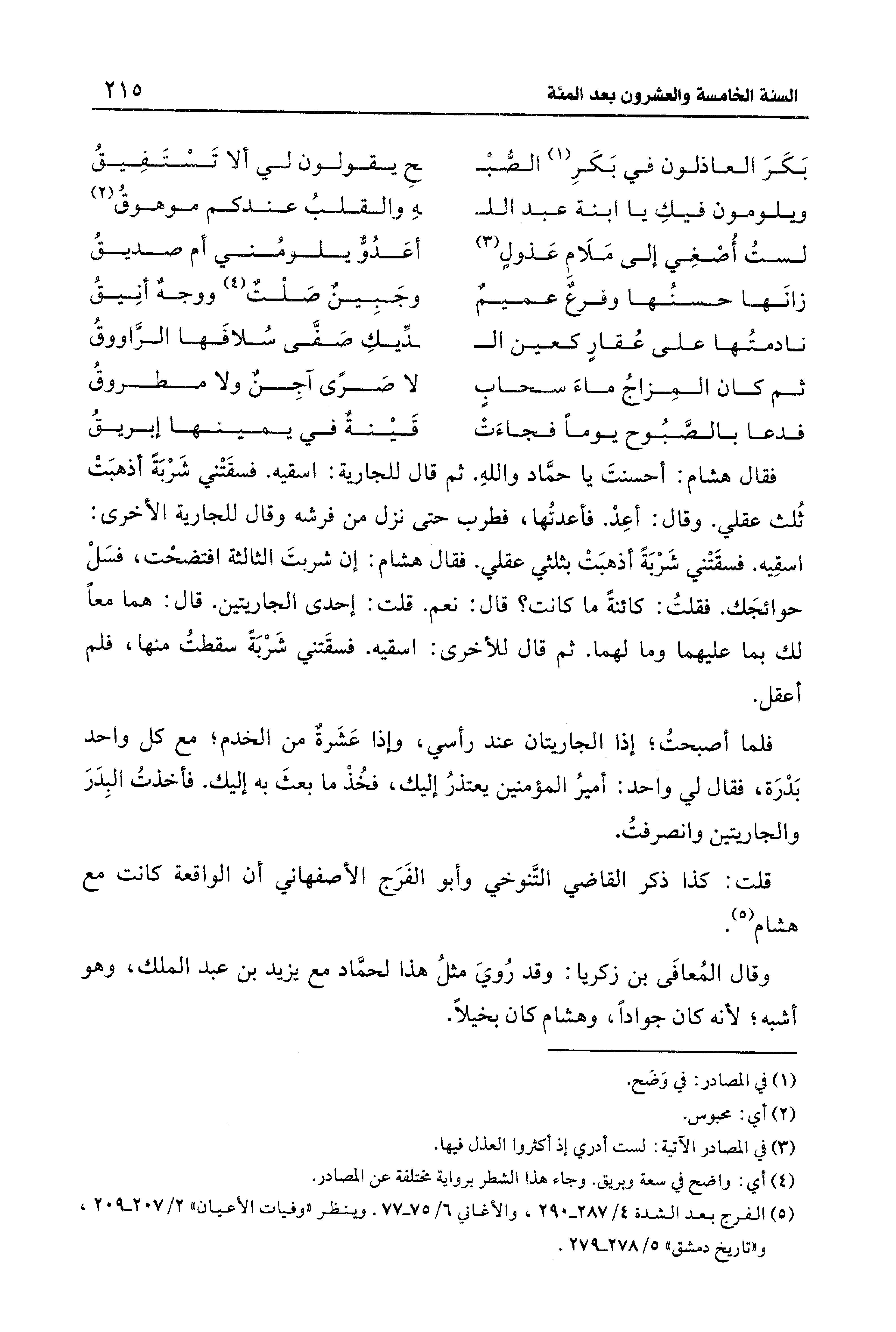 (¬5) الفرج بعد الشدة 4/ 287 - 290، والأغاني 6/ 75 - 77. وينظر "وفيات الأعيان" 2/ 207 - 209، و"تاريخ دمشق" 5/ 278 - 279.
