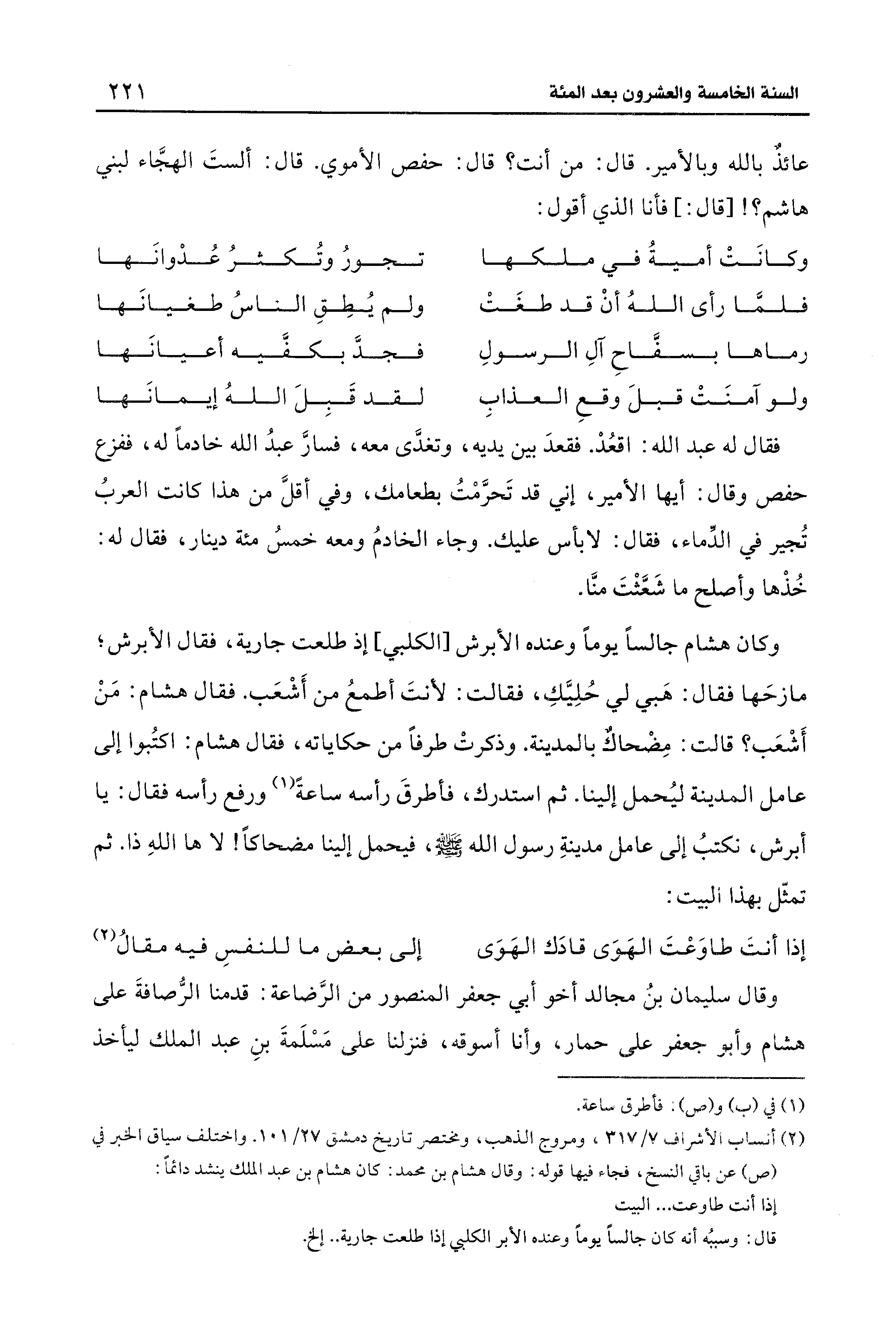 (¬2) أنساب الأشراف 7/ 317، ومروج الذهب، ومختصر تاريخ دمشق 27/ 101. واختلف سياق الخبر في (ص) عن باقي النسخ، فجاء فيها قوله: وقال هشام بن محمَّد: كان هشام بن عبد الملك ينشد دائمًا: