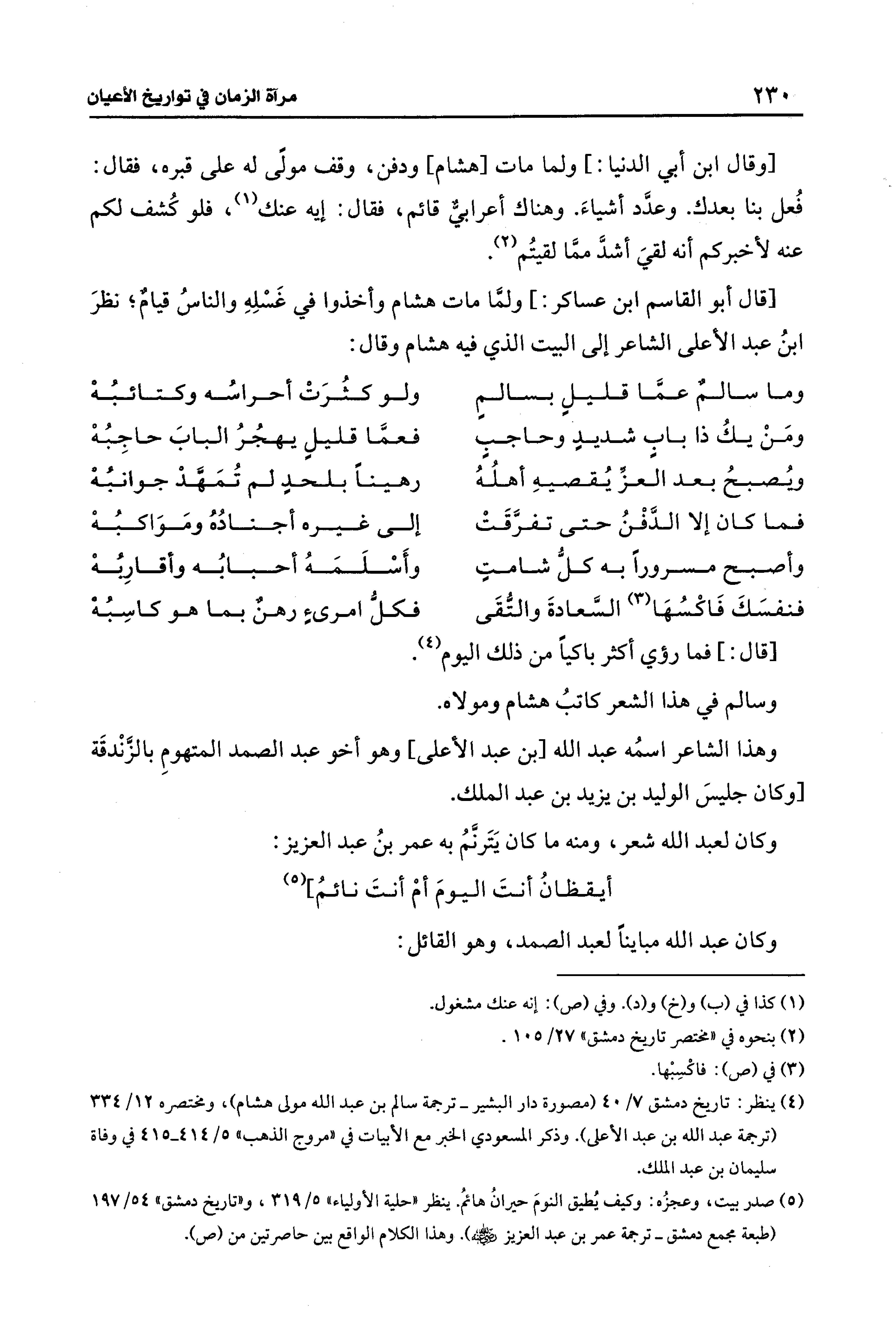 (¬4) ينظر: تاريخ دمشق 7/ 40 (مصورة دار البشير- ترجمة سالم بن عبد الله مولى هشام)، ومختصره 12/ 334 (ترجمة عبد الله بن عبد الأعلى). وذكر المسعودي الخبر مع الأبيات في "مروج الذهب" 5/ 414 - 415 في وفاة سليمان بن عبد الملك.
