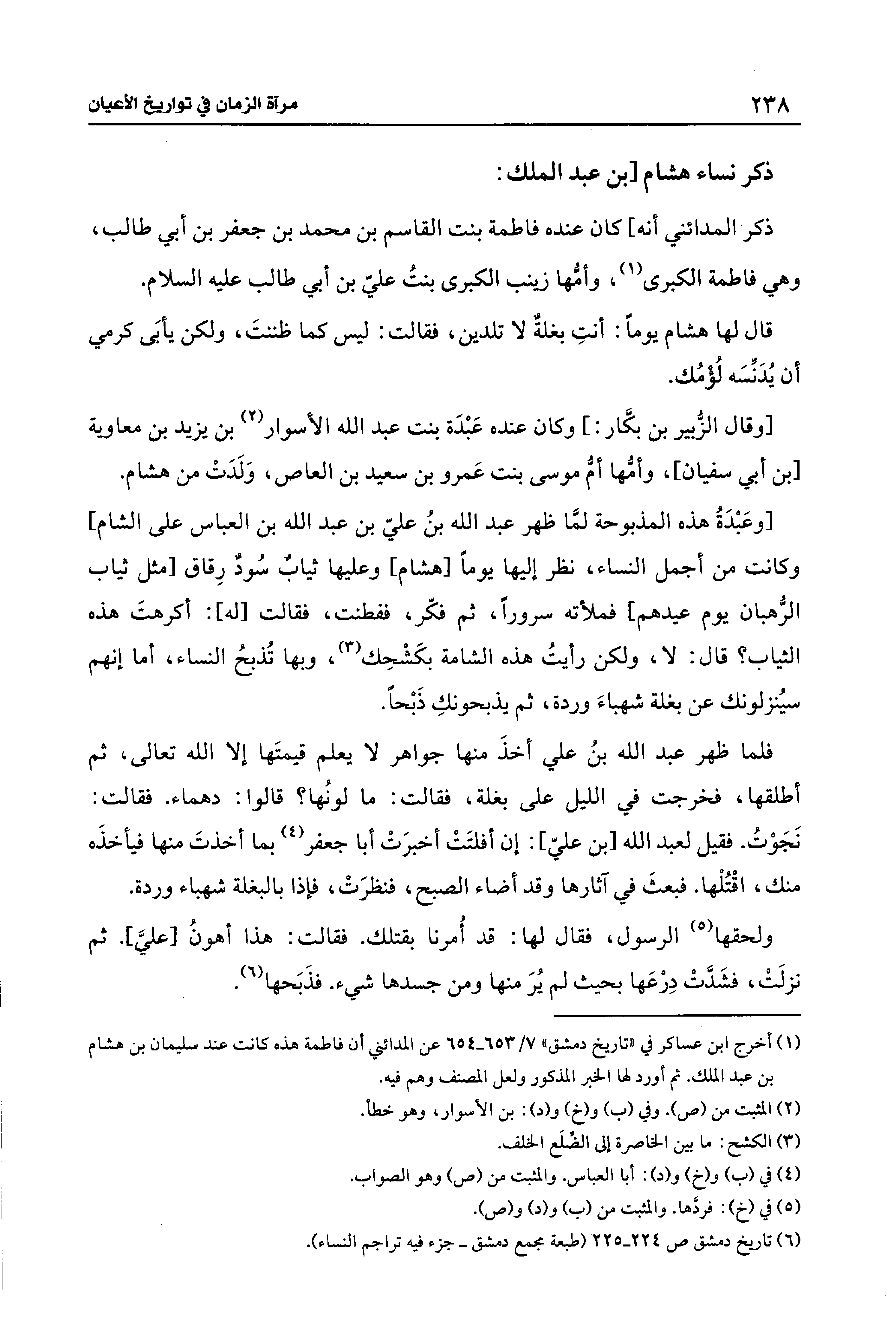 [وعَبْدَةُ هذه المذبوحة لمَّا ظهر عبد الله بنُ عليّ بن عبد الله بن العباس على الشَّام] وكانت من أجمل النساء، نظر إليها يومًا [هشام] وعليها ثيابٌ سُودٌ رِقاق [مثل ثياب الرُّهبان يوم عيدهم] فملأته سرورًا، ثم فكّر، ففطنت، فقالت [له]: أكرهتَ هذه الثياب؟ قال: لا، ولكن رأيتُ هذه الشامة بكَشْحِك (¬3)، وبها تُذبحُ النساء، أما إنهم سيُنزلونك عن بغلة شهباءَ وردة، ثم يذبحونكِ ذَبْحًا.