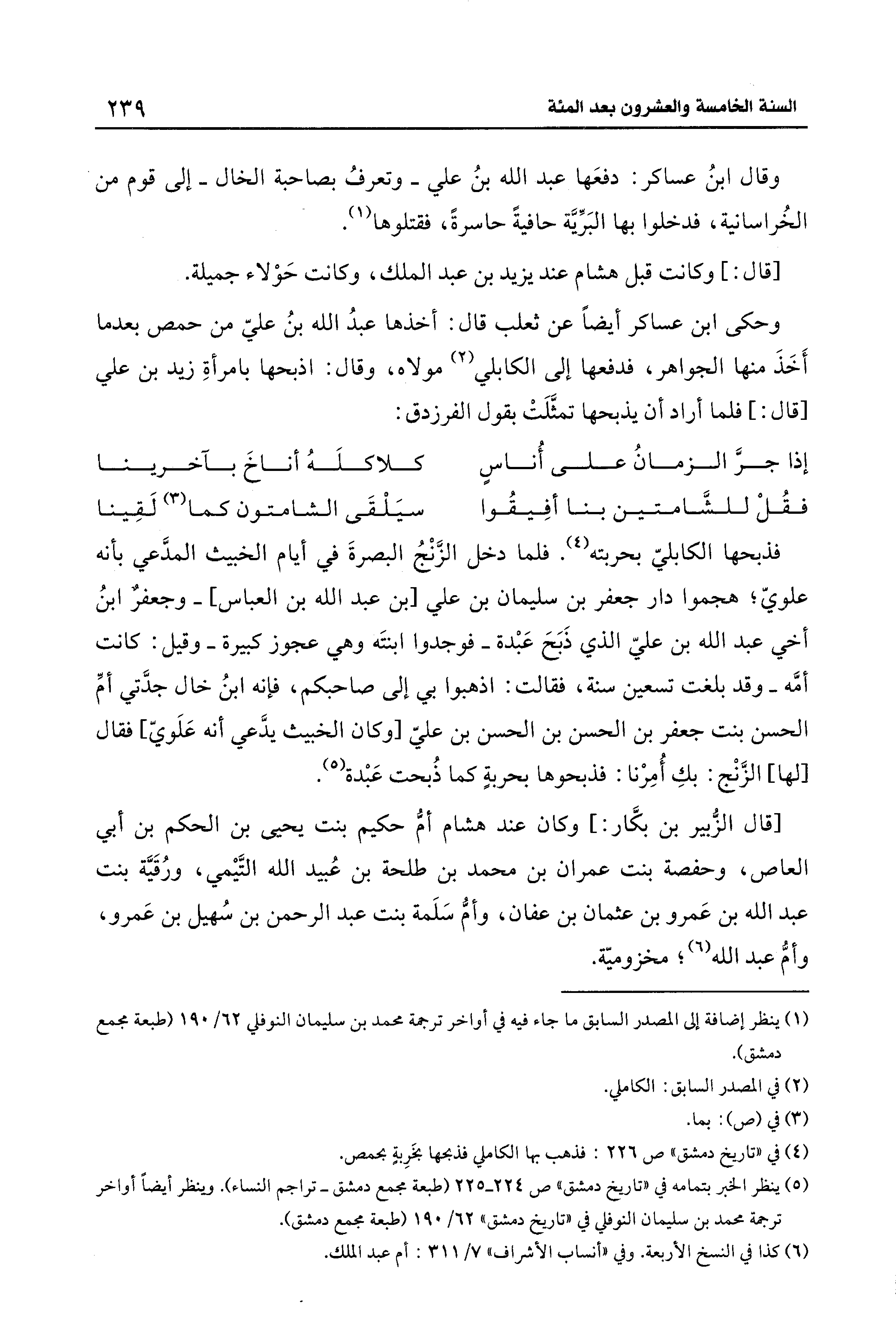 (¬5) ينظر الخبر بتمامه في "تاريخ دمشق" ص 224 - 225 (طبعة مجمع دمشق- تراجم النساء). وينظر أَيضًا أواخر ترجمة محمَّد بن سليمان النوفلي في "تاريخ دمشق" 62/ 190 (طبعة مجمع دمشق).