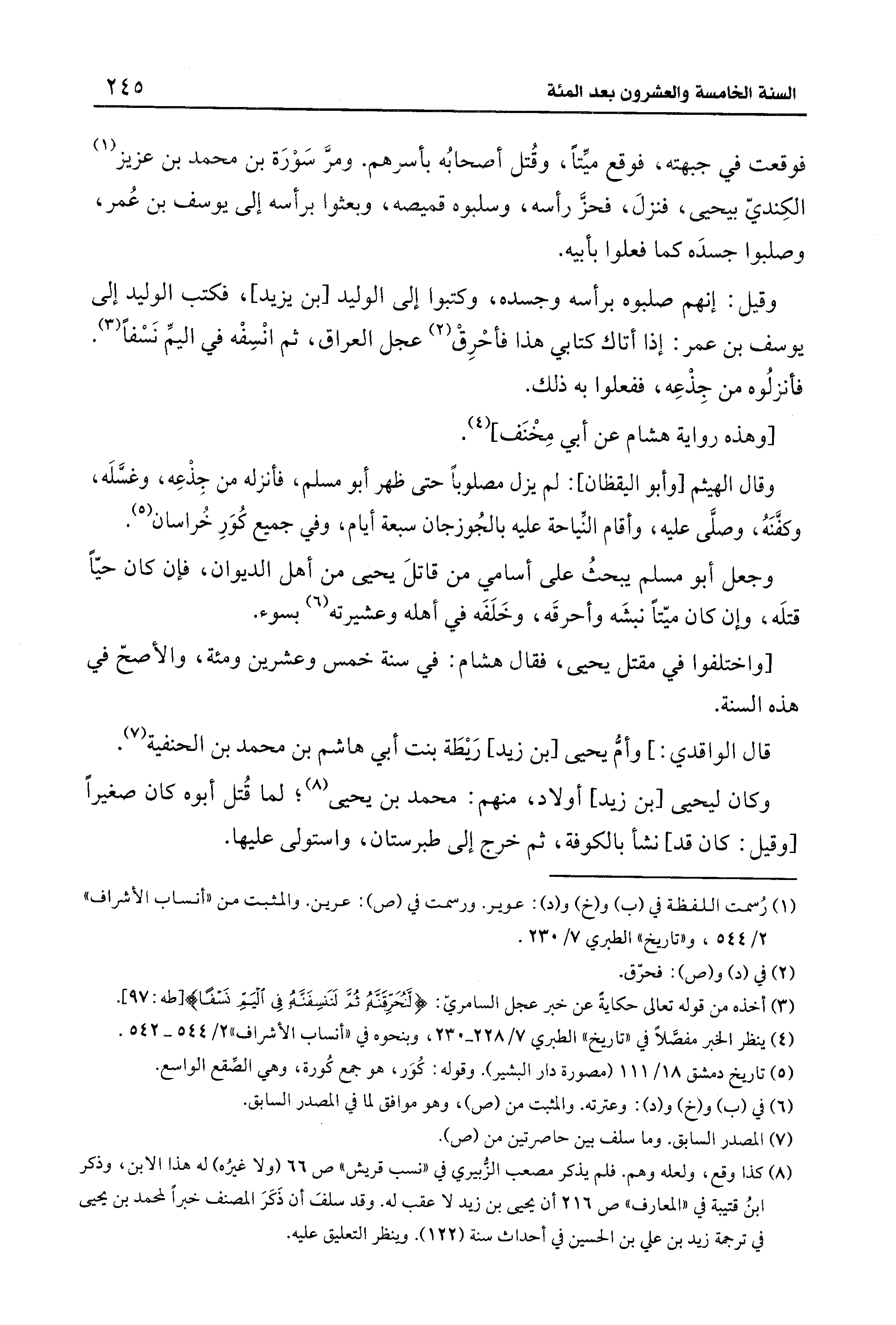 فوقعت في جبهته، فوقع ميِّتًا، وقُتل أصحابُه بأسرهم. ومرَّ سوْرَة بن مُحَمَّد بن عزيز (¬1) الكِنديّ بيحيى، فنزلَ، فحزَّ رأسه، وسلبوه قميصه، وبعثوا برأسه إلى يوسف بن عُمر، وصلبوا جسدَه كما فعلوا بأبيه.