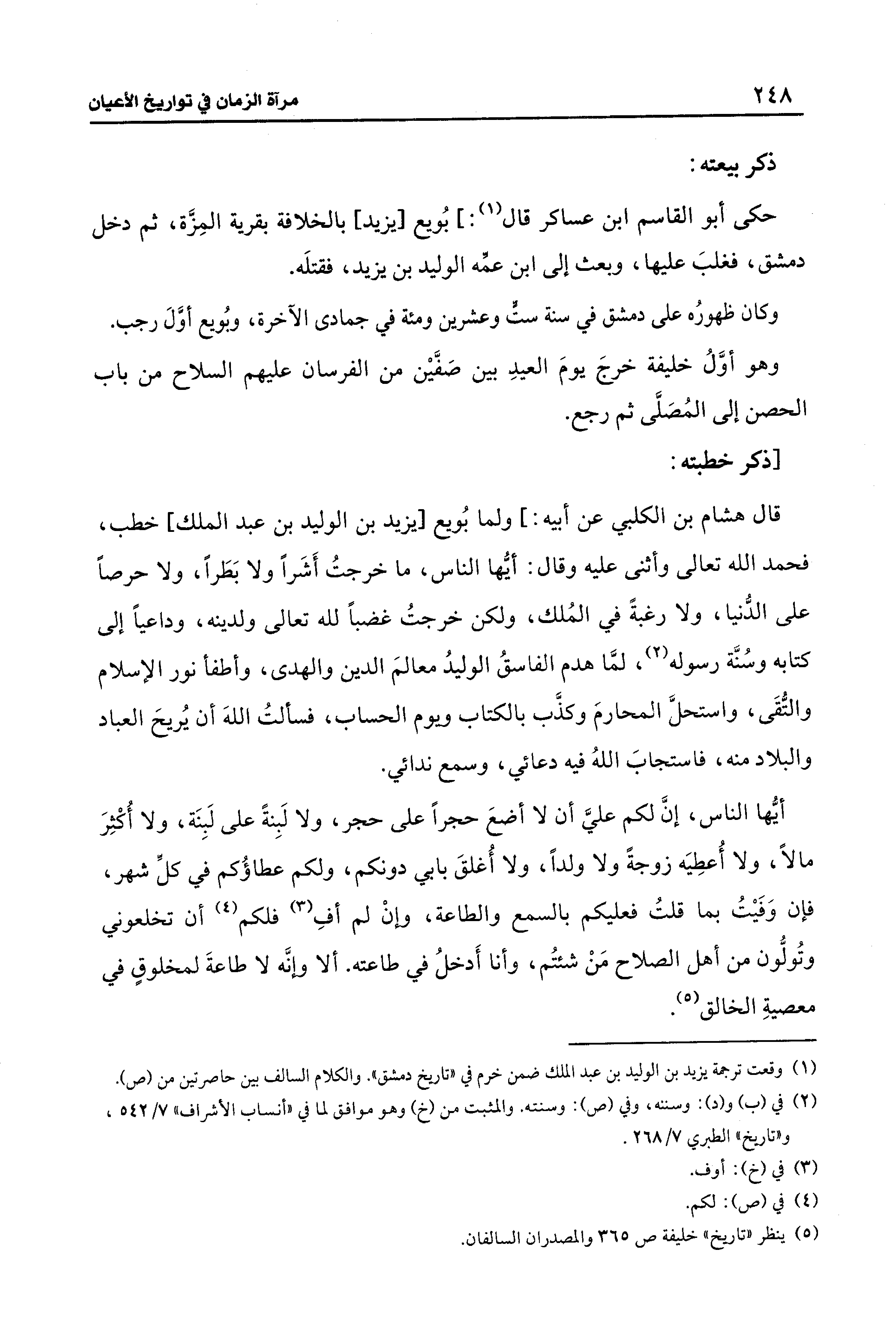 قال هشام بن الكلبي عن أبيه: ] ولما بُويع [يزيد بن الوليد بن عبد الملك] خطب، فحمد الله تعالى وأثنى عليه وقال: أيُّها الناس، ما خرجتُ أَشَرًا ولا بَطَرًا، ولا حرصًا على الدُّنيا، ولا رغبةً في المُلك، ولكن خرجتُ غضبًا لله تعالى ولدينه، وداعيًا إلى كتابه وسُنَّة رسوله (¬2)، لمَّا هدم الفاسقُ الوليدُ معالمَ الدين والهدى، وأطفأ نور الإسلام والتُّقَى، واستحلَّ المحارمَ وكذَّب بالكتاب ويوم الحساب، فسألتُ اللهَ أن يُريحَ العباد والبلاد منه، فاستجابَ اللهُ فيه دعائي، وسمع ندائي.