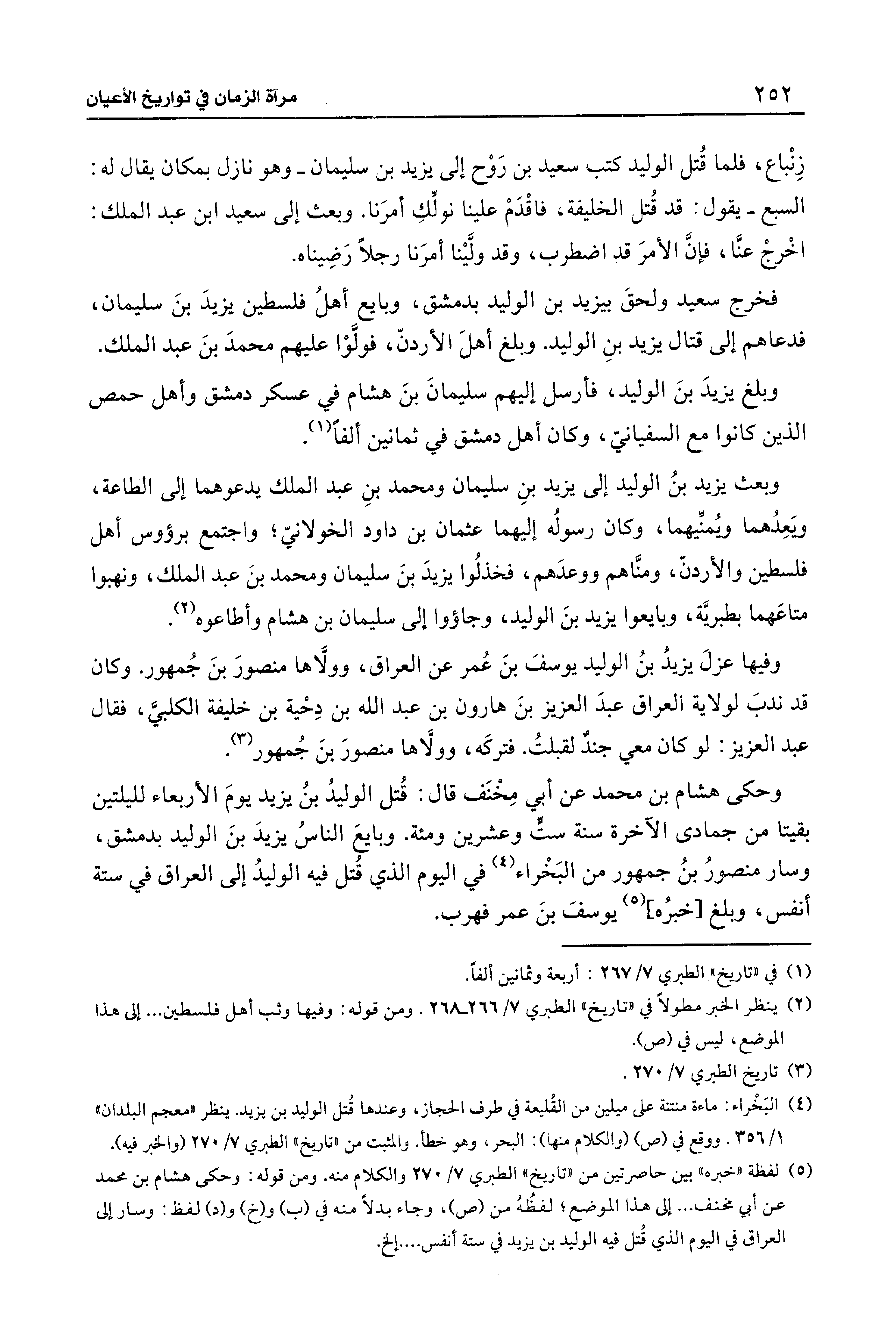 وحكى هشام بن محمد عن أبي مِخْنَف قال: قُتل الوليدُ بنُ يزيد يومَ الأربعاء لليلتين بقيتا من جمادى الآخرة سنة ستٍّ وعشرين ومئة. وبايعَ الناسُ يزيدَ بنَ الوليد بدمشق، وسار منصورُ بنُ جمهور من البَخْراء (¬4) في اليوم الذي قُتل فيه الوليدُ إلى العراق في ستة أنفس، وبلغ [خبرُه] (¬5) يوسفَ بنَ عمر فهرب.