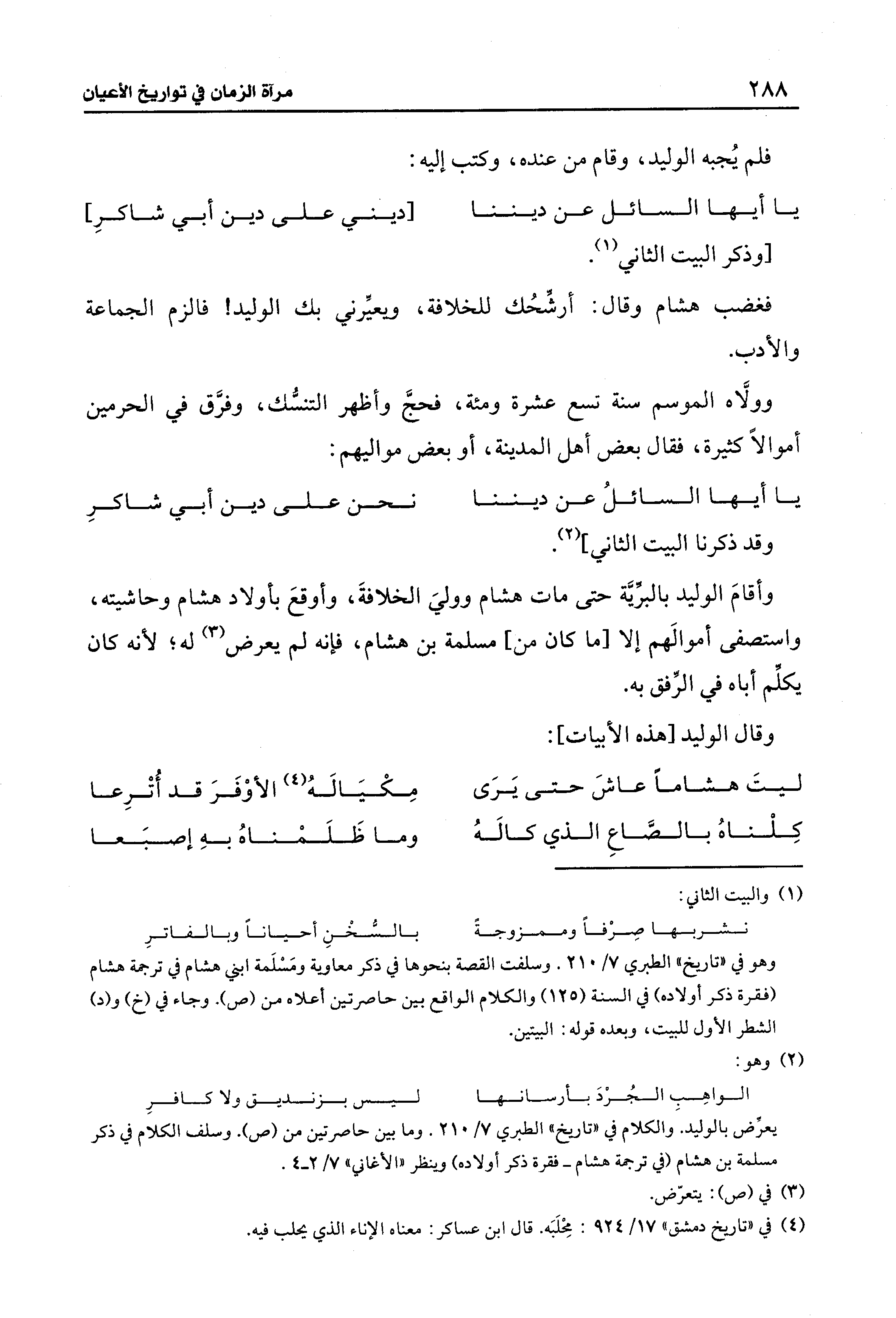 وهو في "تاريخ" الطبري 7/ 210. وسلفت القصة بنحوها في ذكر معاوية ومَسْلَمة ابني هشام في ترجمة هشام (فقرة ذكر أولاده) في السنة (125) والكلام الواقع بين حاصرتين أعلاه من (ص). وجاء في (خ) و (د) الشطر الأول للبيت، وبعده قوله: البيتين.